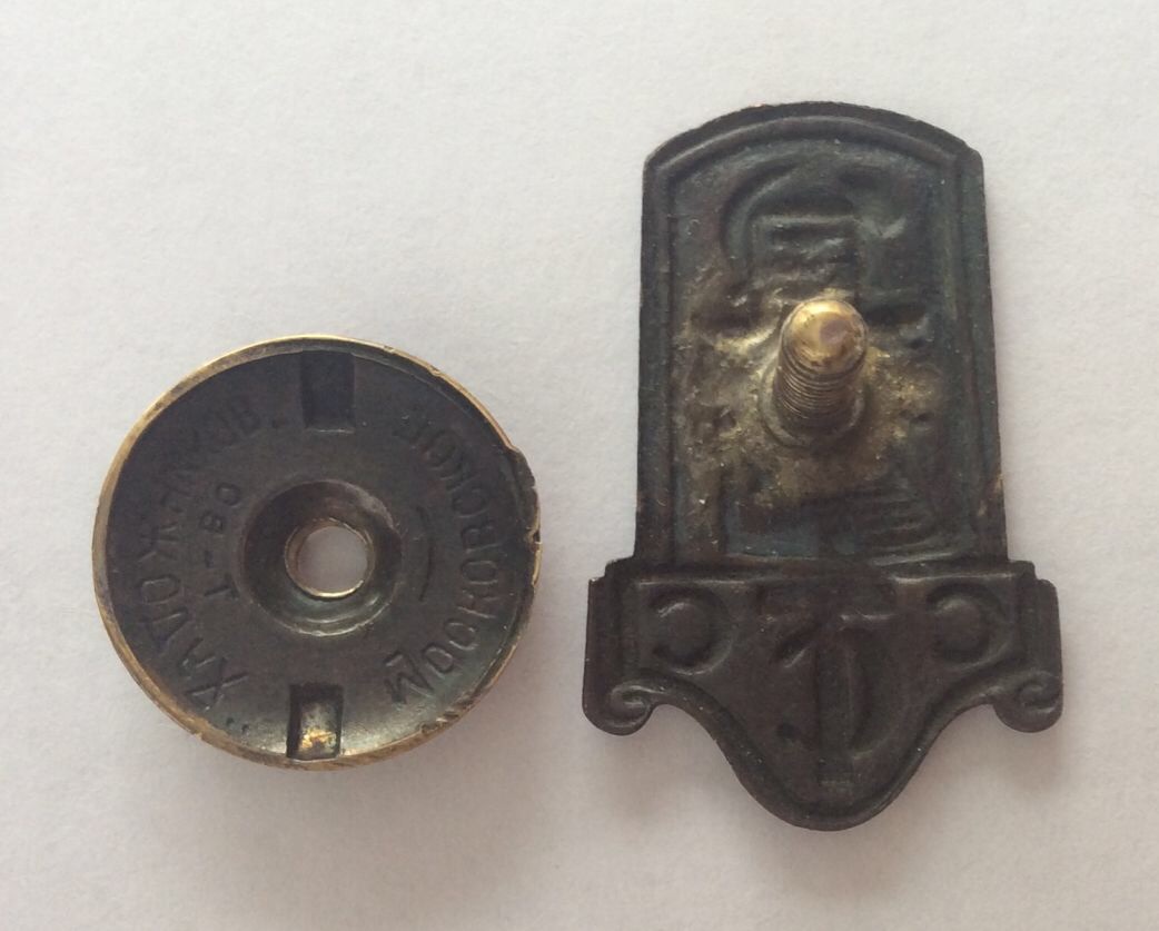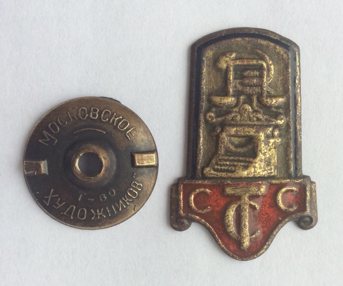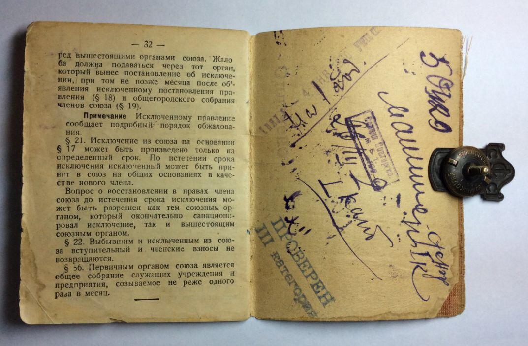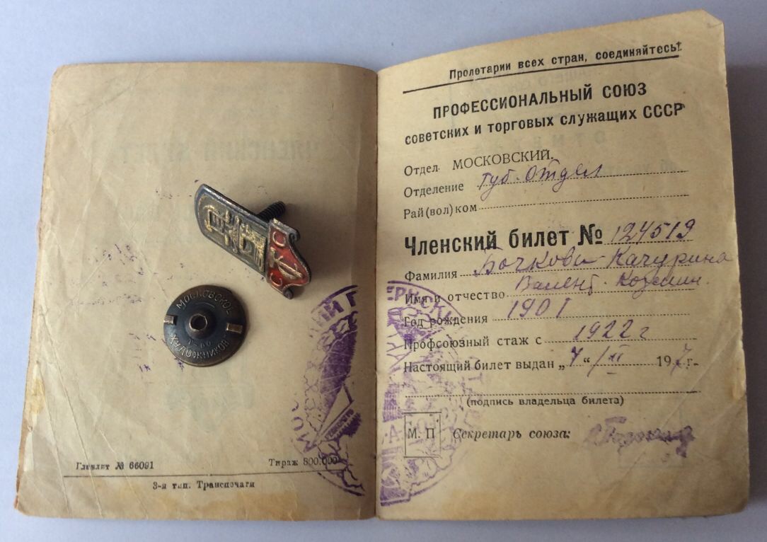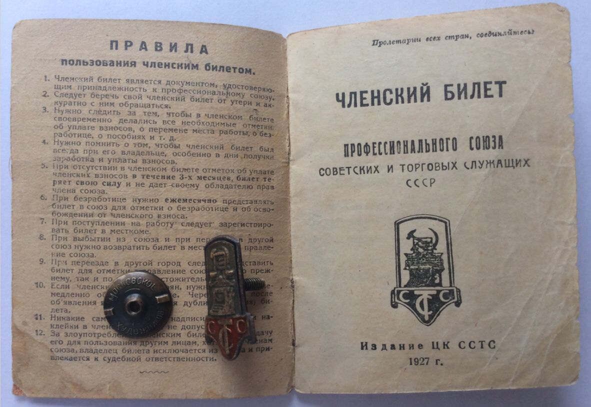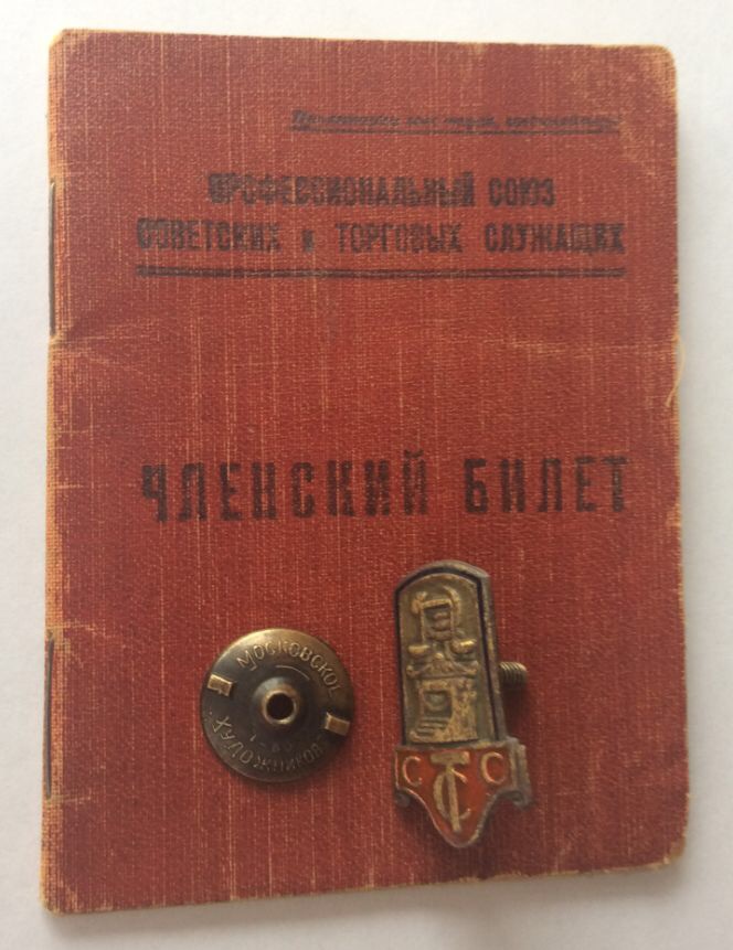 Членский знак и членский билет Профессионального союза советских и торгов служащих.