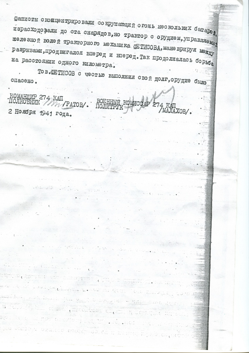 «Трактор с орудием, управляемый железной волей механика Фетисова, маневрируя между разрывами, продвигался вперёд и вперёд. Так продолжалась борьба на расстоянии одного километра». Сколько по времени продолжались на поле эти зигзаги Фетисова? Скорее всего свидетели этого подвига были шокированы (с обеих сторон!), иначе представили бы к Красной Звезде, а не к Боевому Красному Знамени. В представлении указано, что Фетисов в боях не участвовал. В тот год на награды скупились, дотошно проверяли каждый факт, досконально опрашивали свидетелей подвигов. Фетисов ни разу не выстрелит во врага, но совершил достойнейший БКЗ Подвиг и без этого.