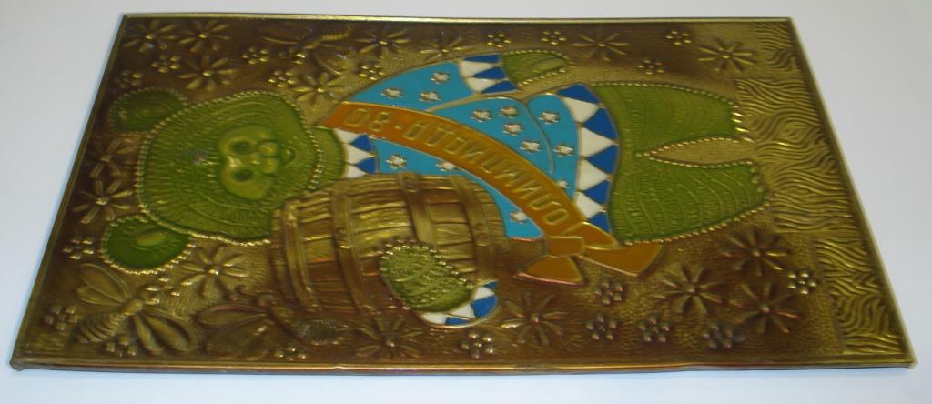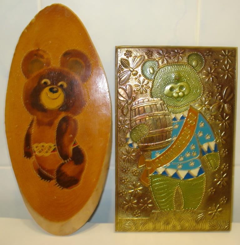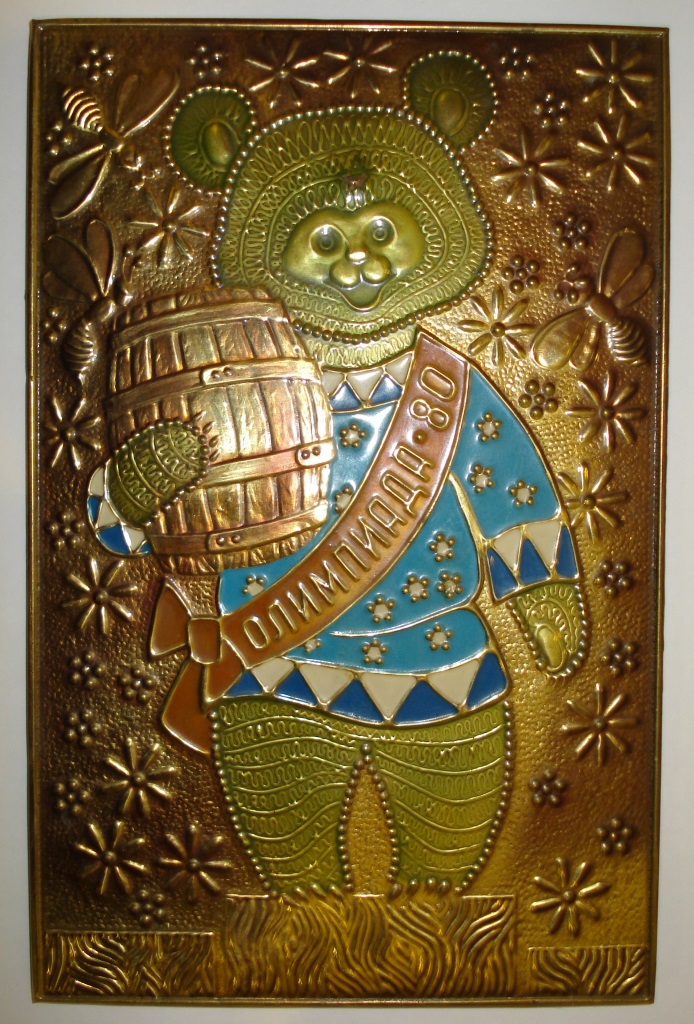 Правый мишка: габариты: 25 х 16 см, чеканка, эмаль 4-х цветная.