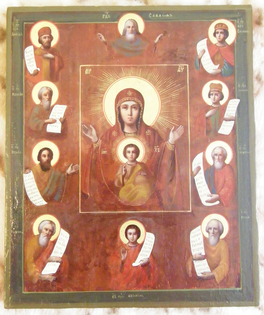 лики, руки, родные + современное письмо: прописана по полю, периметру, свитки,одеяние,"золочение" нимбов...оклада нет.