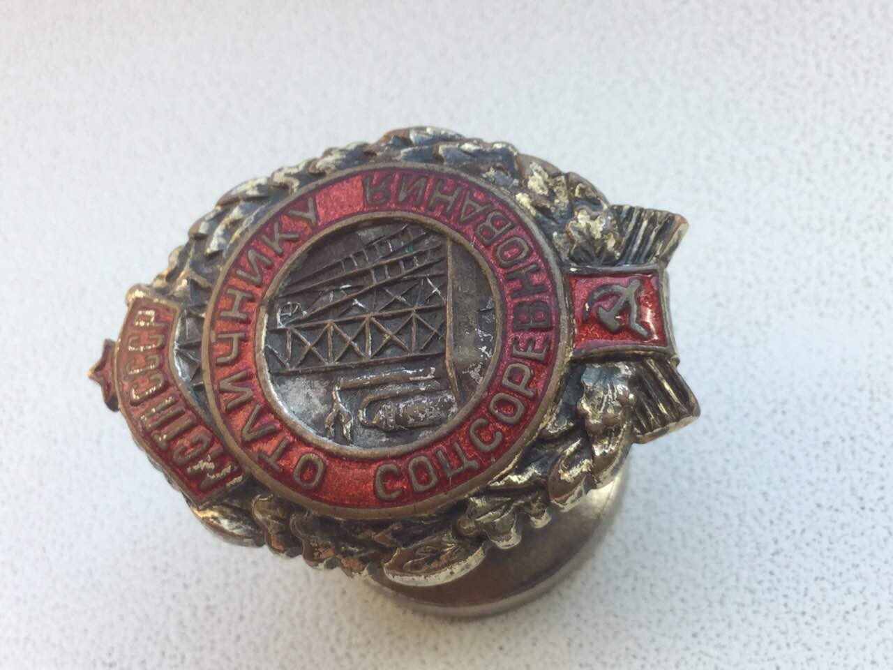 Знак в хорошем состоянии,сколов по эмали нигде нет,немного искривлён винт,гайка накручивается хорошо,без люфта,винт длинный,в РФ+5$,предложите в долларах.
