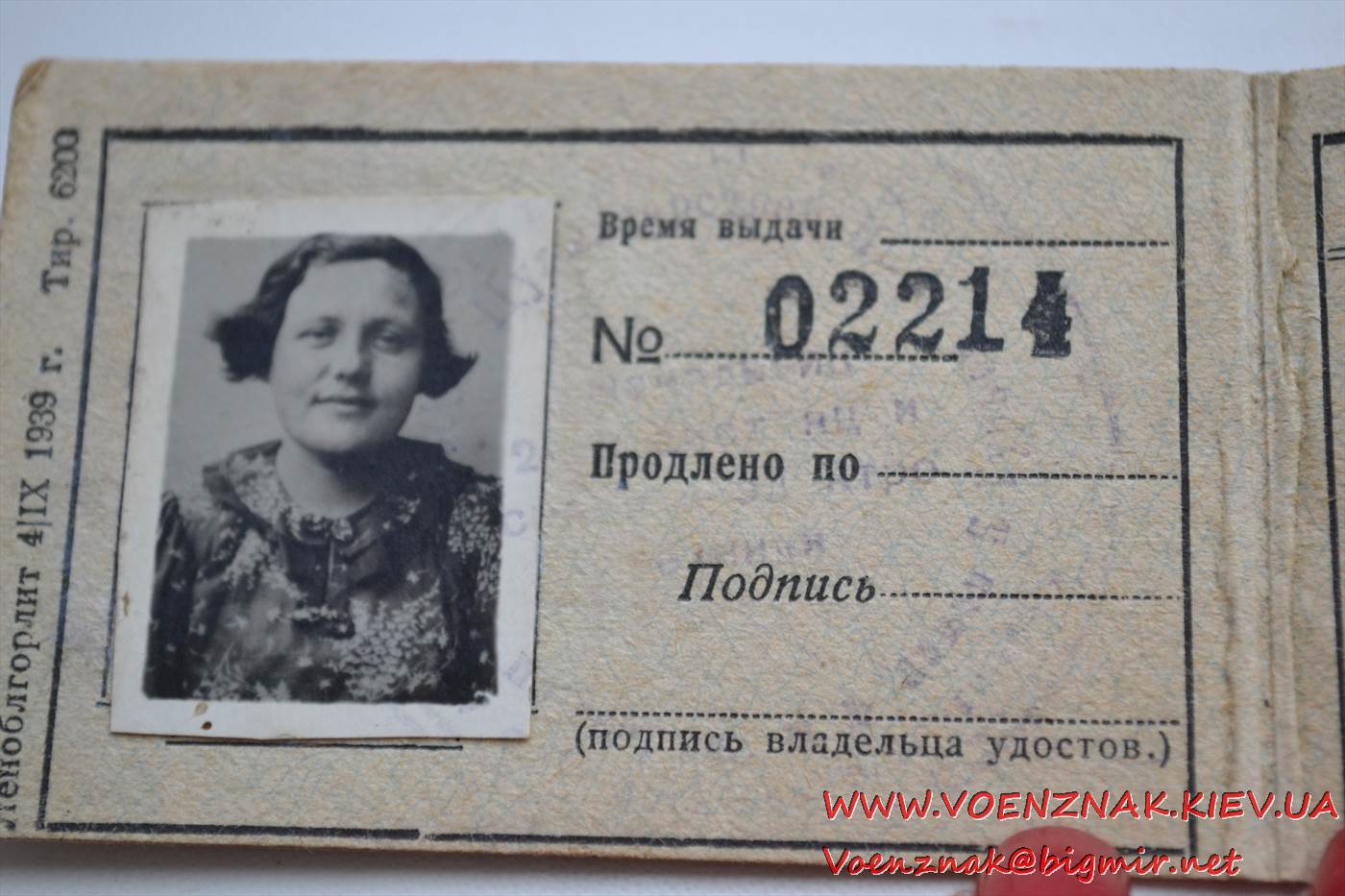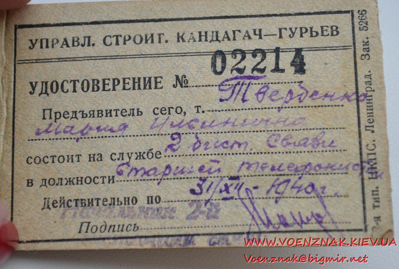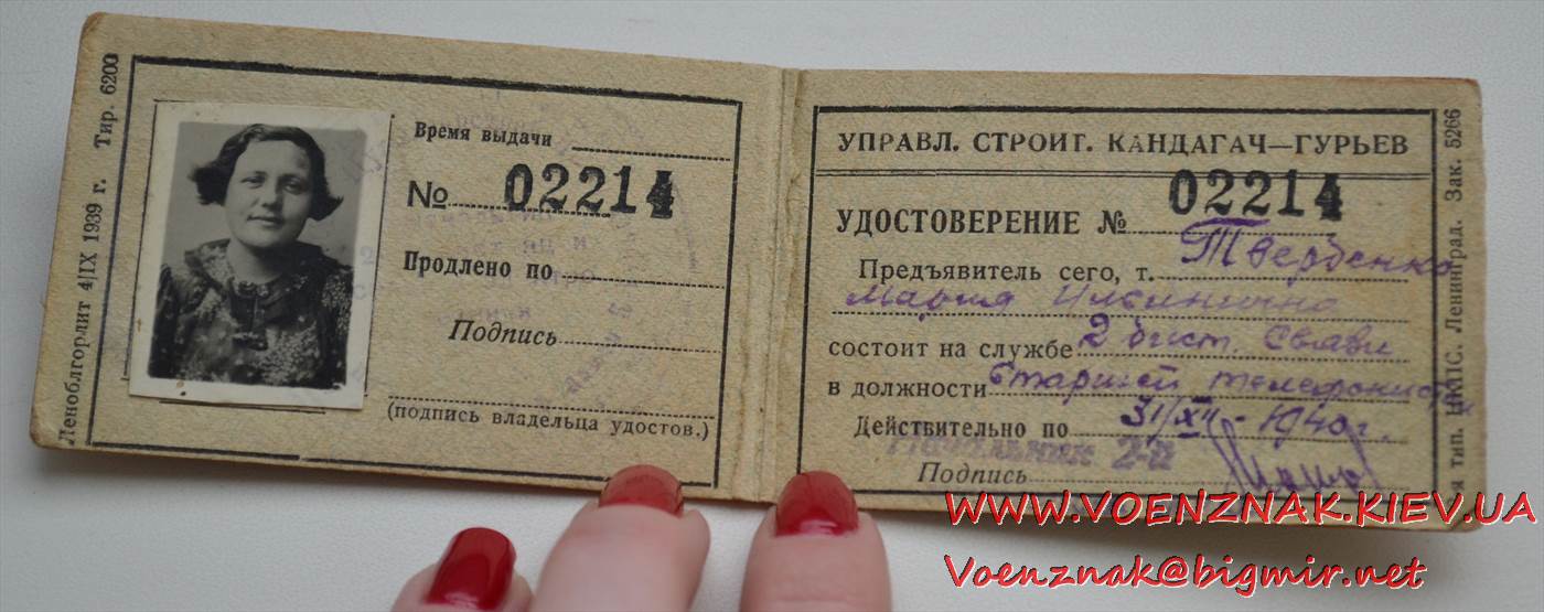Удостоверение № 02214 на женщину. Народный коммисариат путей сообщения СССР. 1940 год