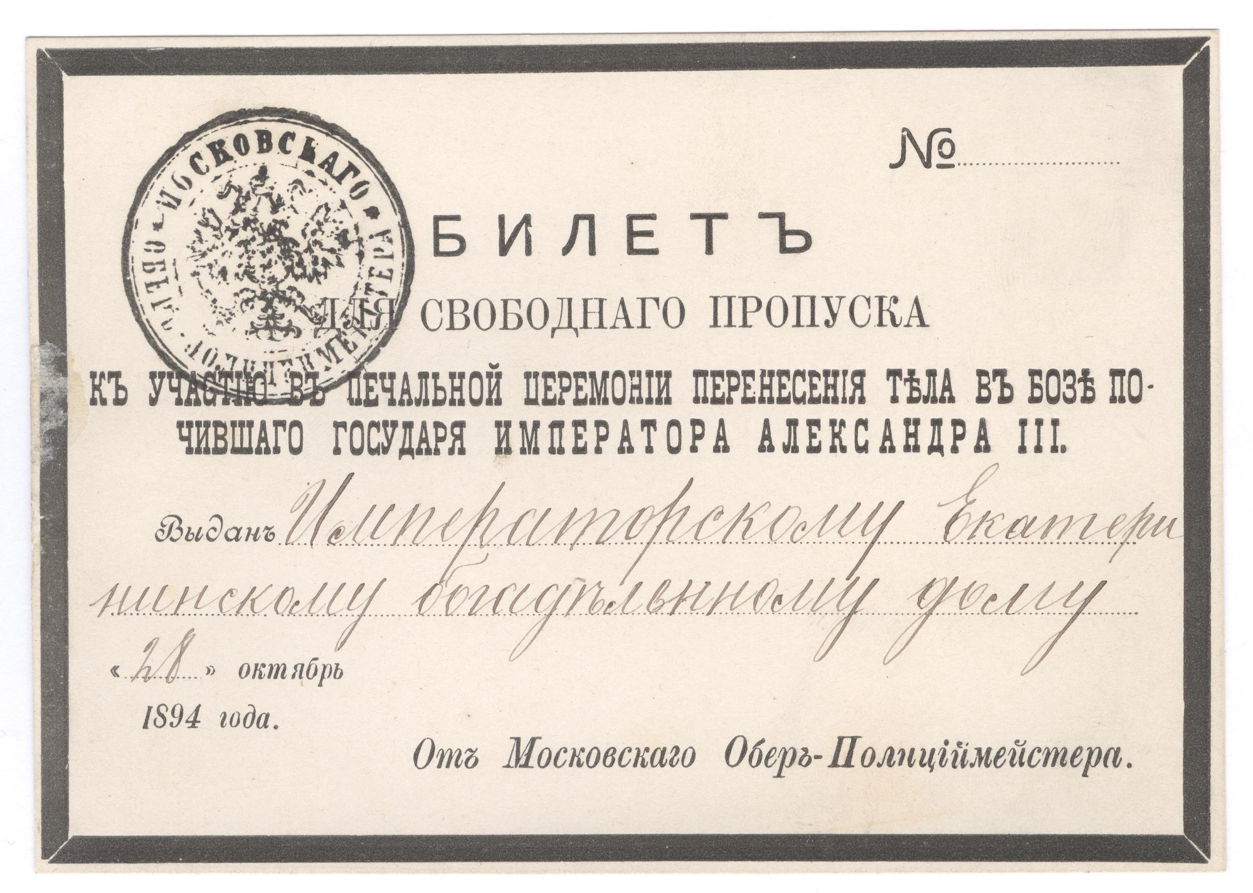 Билет на участие в похоронах Александра III, 1894 г. Михаил Ю. - 16 апр 2017 17:19.07 × Мини профиль пользователя Михаил Ю. Сообщения: 15620 Зарегистрирован: 23 мар 2004 09:13.44 Откуда: г. Екатеринбург Статус: Не в сети - 16 апр 2017 17:19.07 #5982007 Фото С уважением, Михаил.