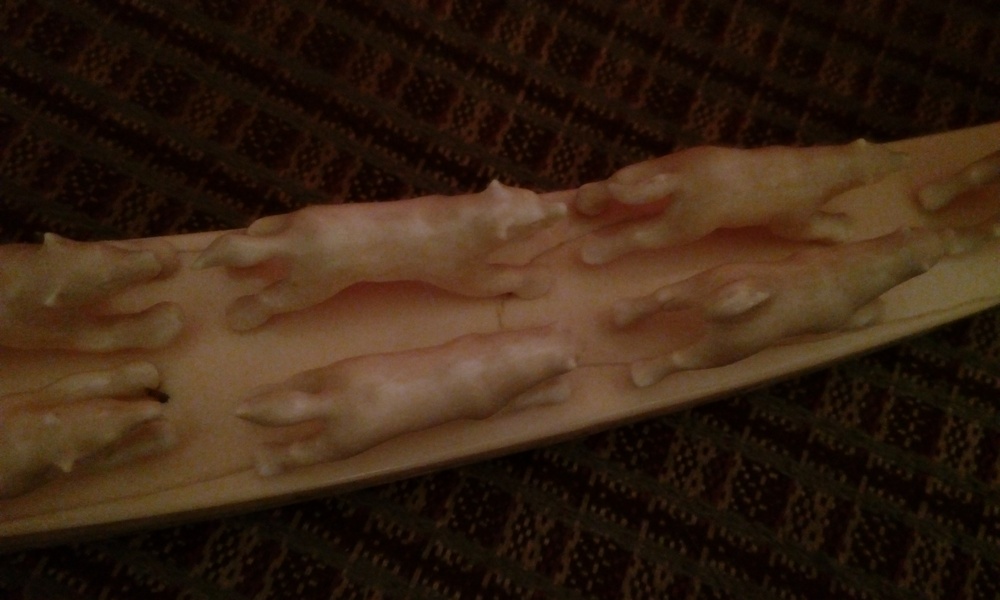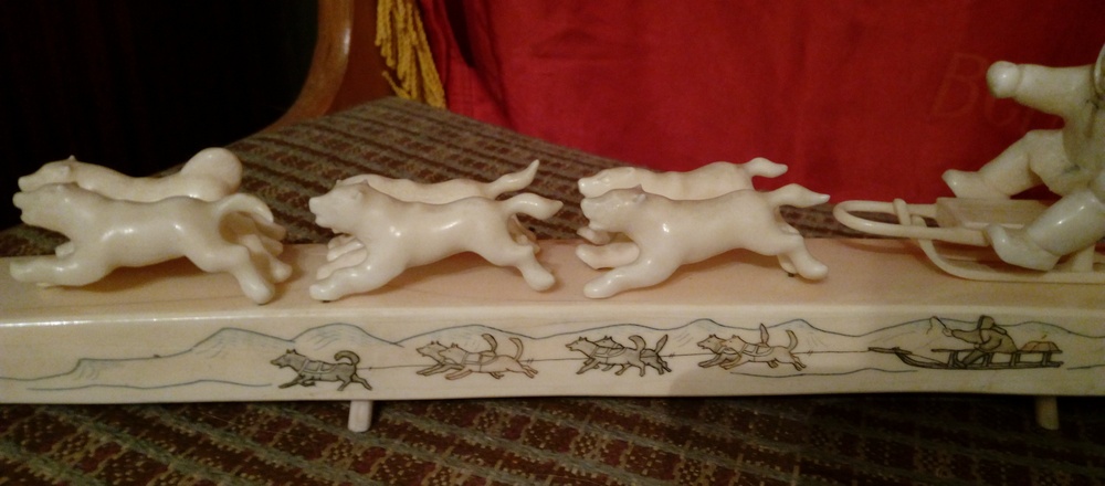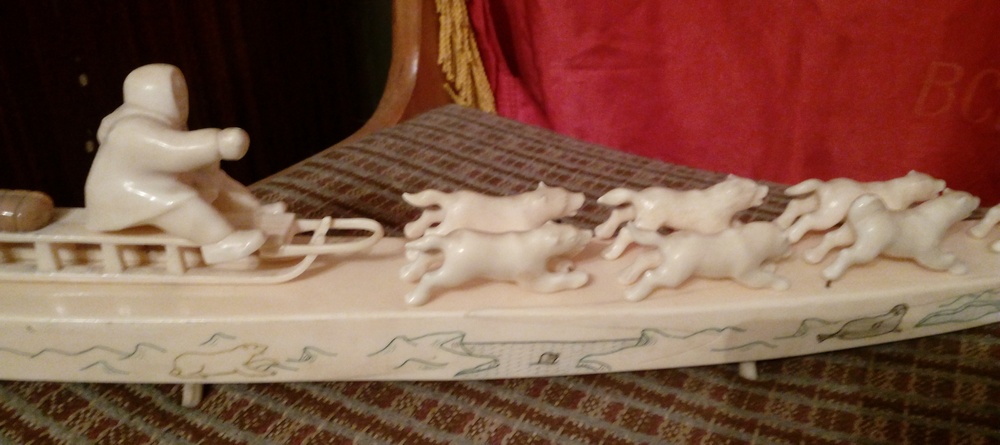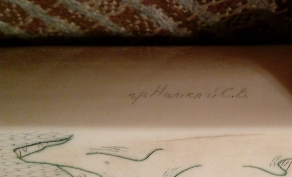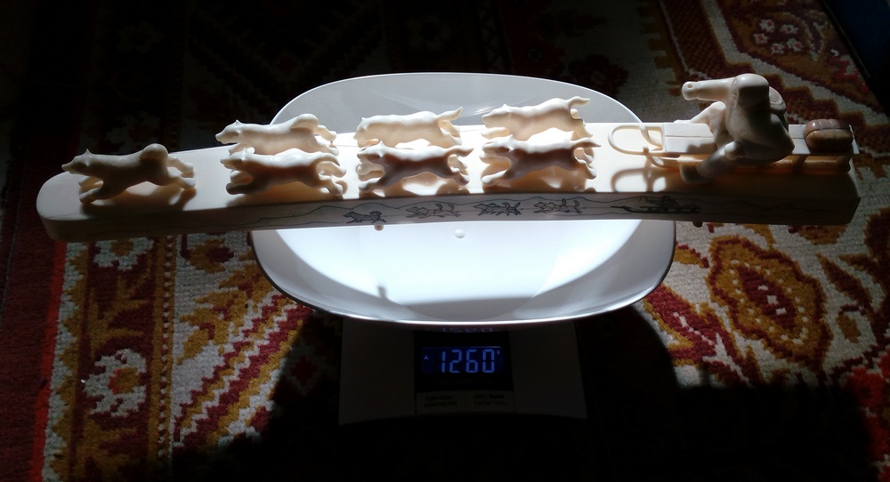 Добрый вечер! Длинна 41 см, вес 1260 грамм. Не все держаться на штырьках. Есть трещины, с отслоением бивня..Смотрите внимательно все фото..Предлагайте..