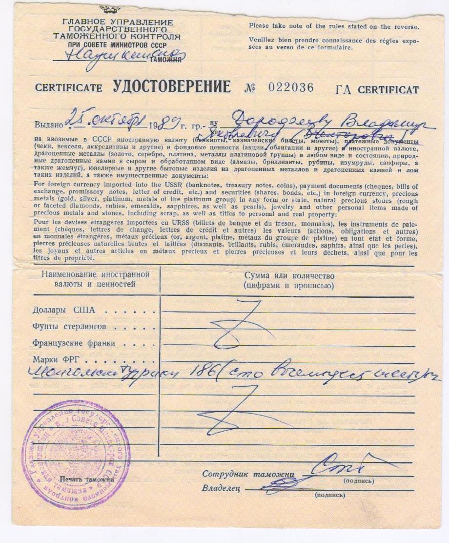 Главное управление ГТК СССР удостоверение на ввоз монгольских . тугриков.