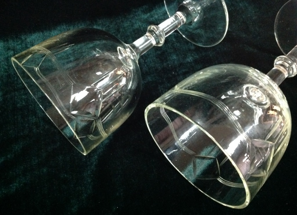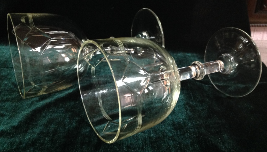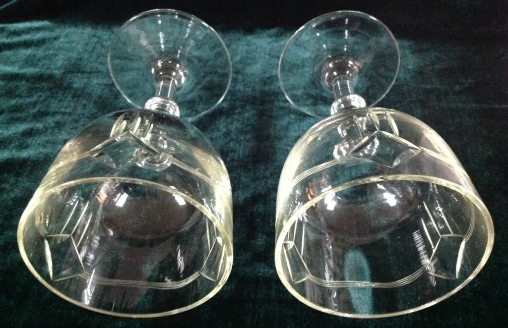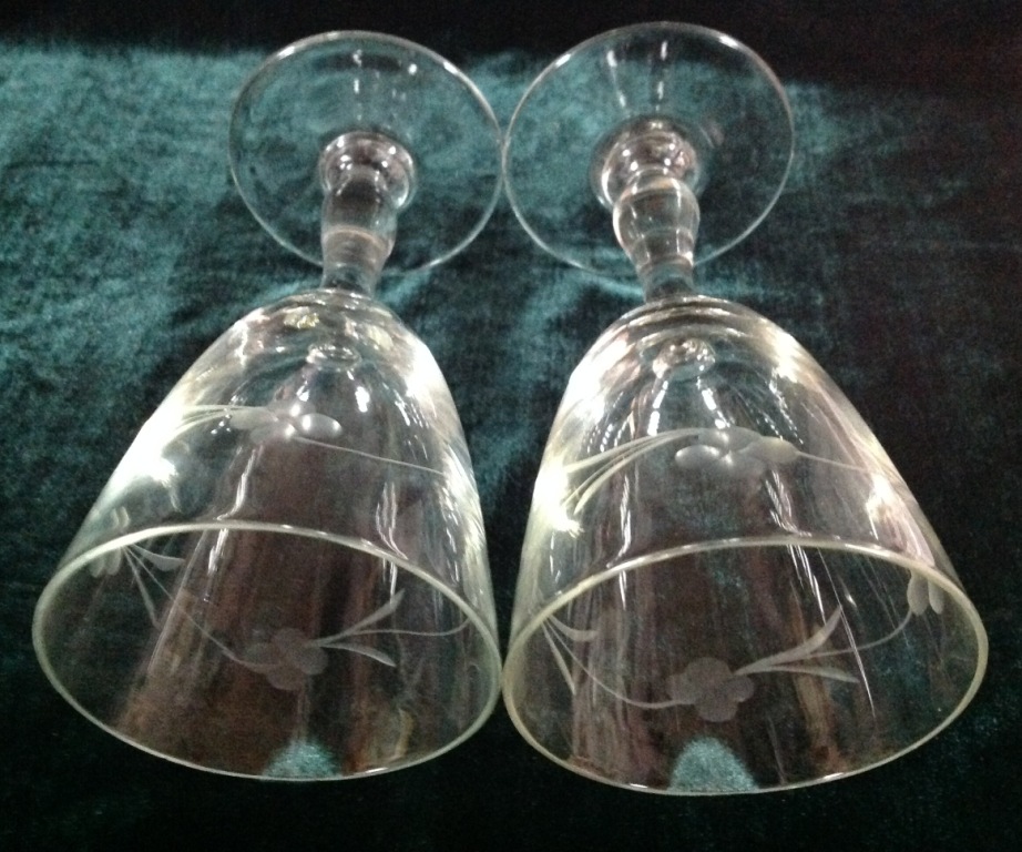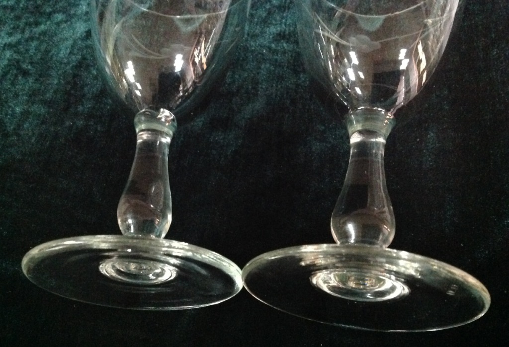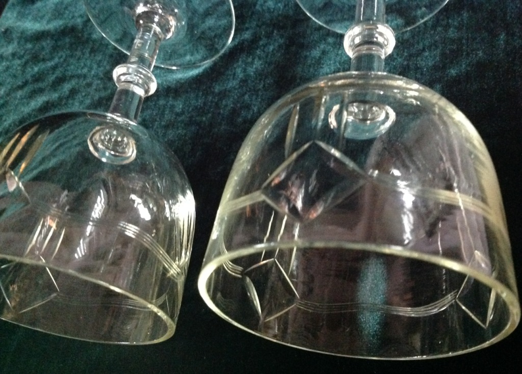 Высота самого высокого 17,7см. Остальные примерно 15 см. Отливают чуть в желтизну...трудно фоткать стекло...Не знаю-получилась ли цветопередача...На одном фужере на основании-запил небольшой-как будто метка.Думаю что то заводское..Пузырьки присутствуют...Предложите по РФ!