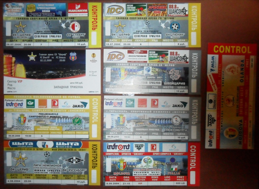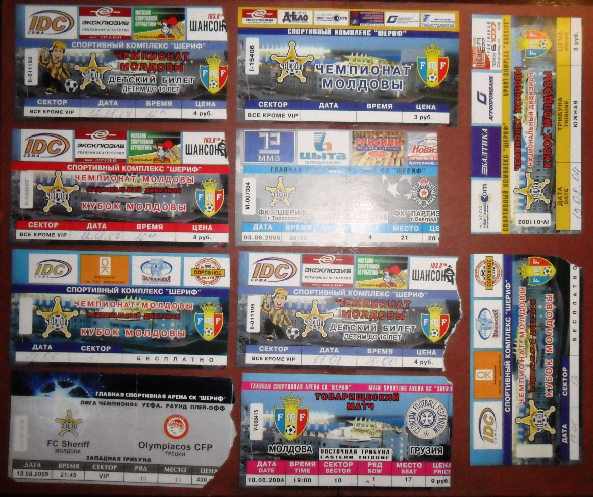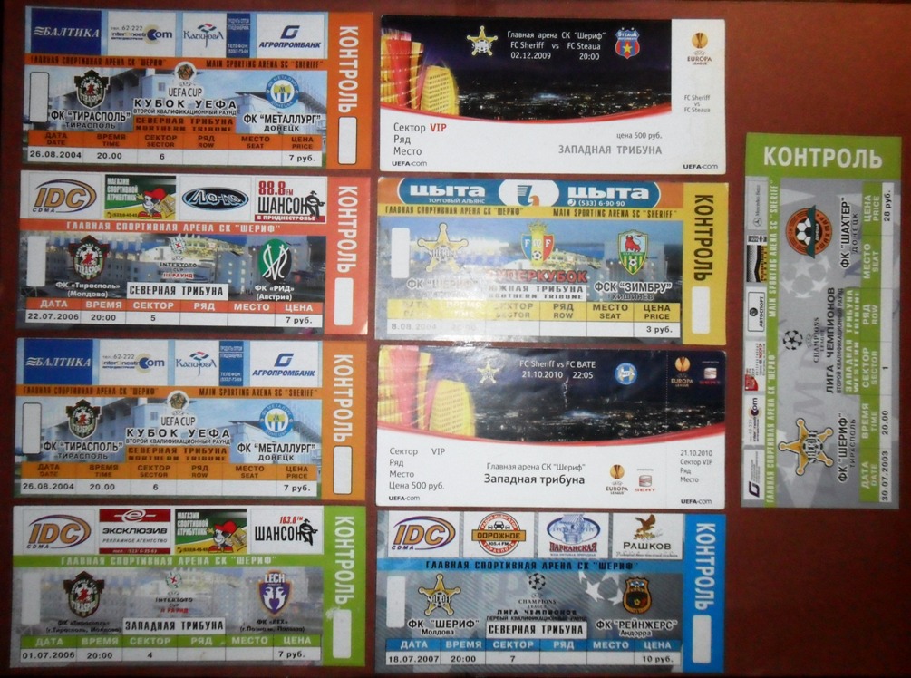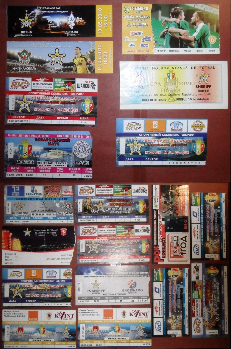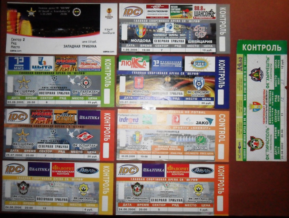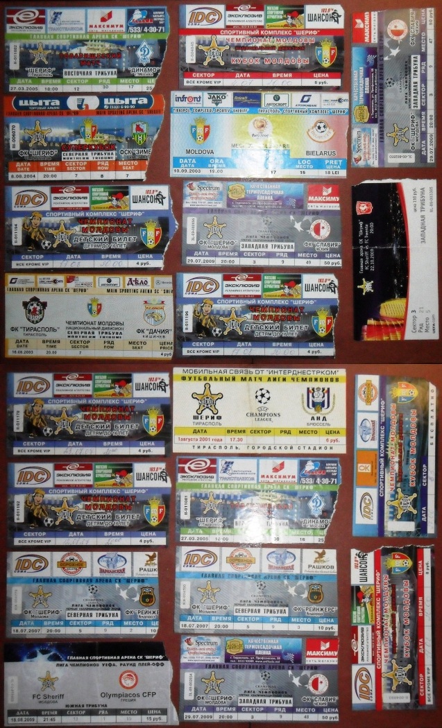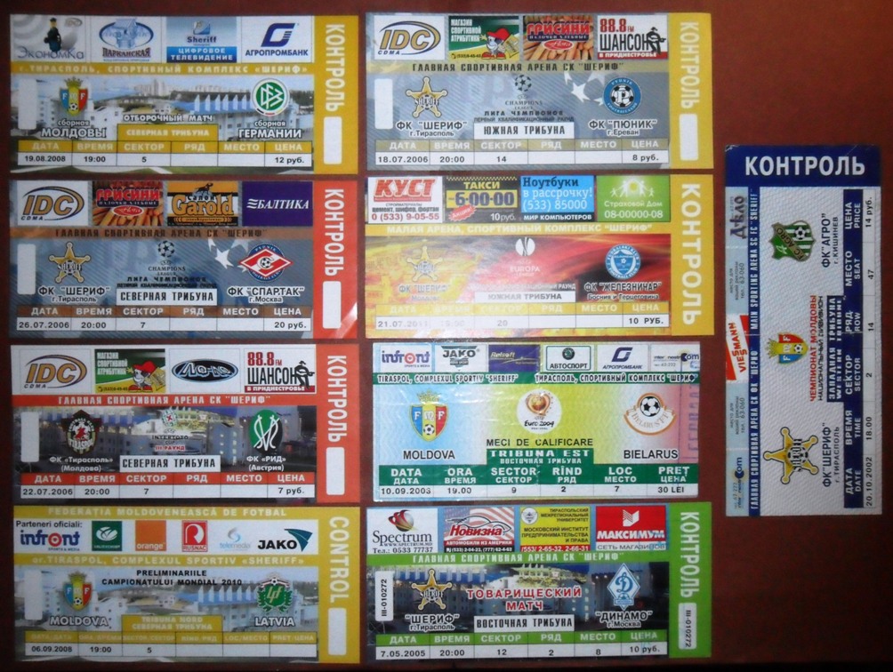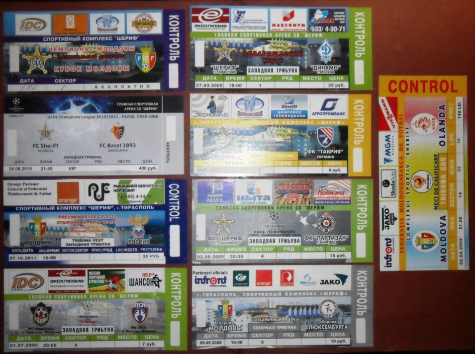 Общее количество - 366 штук + 3 пропуска для автомобилей + 23 билета на концерт. Период - с 1997 г. по 2012 г. Основная масса - местные, Тираспольские, билеты на стадион "Шериф". Хотелось бы продать всё оптом. Пересыл обойдётся где-то рублей 400-450. Предложите, если есть интерес.