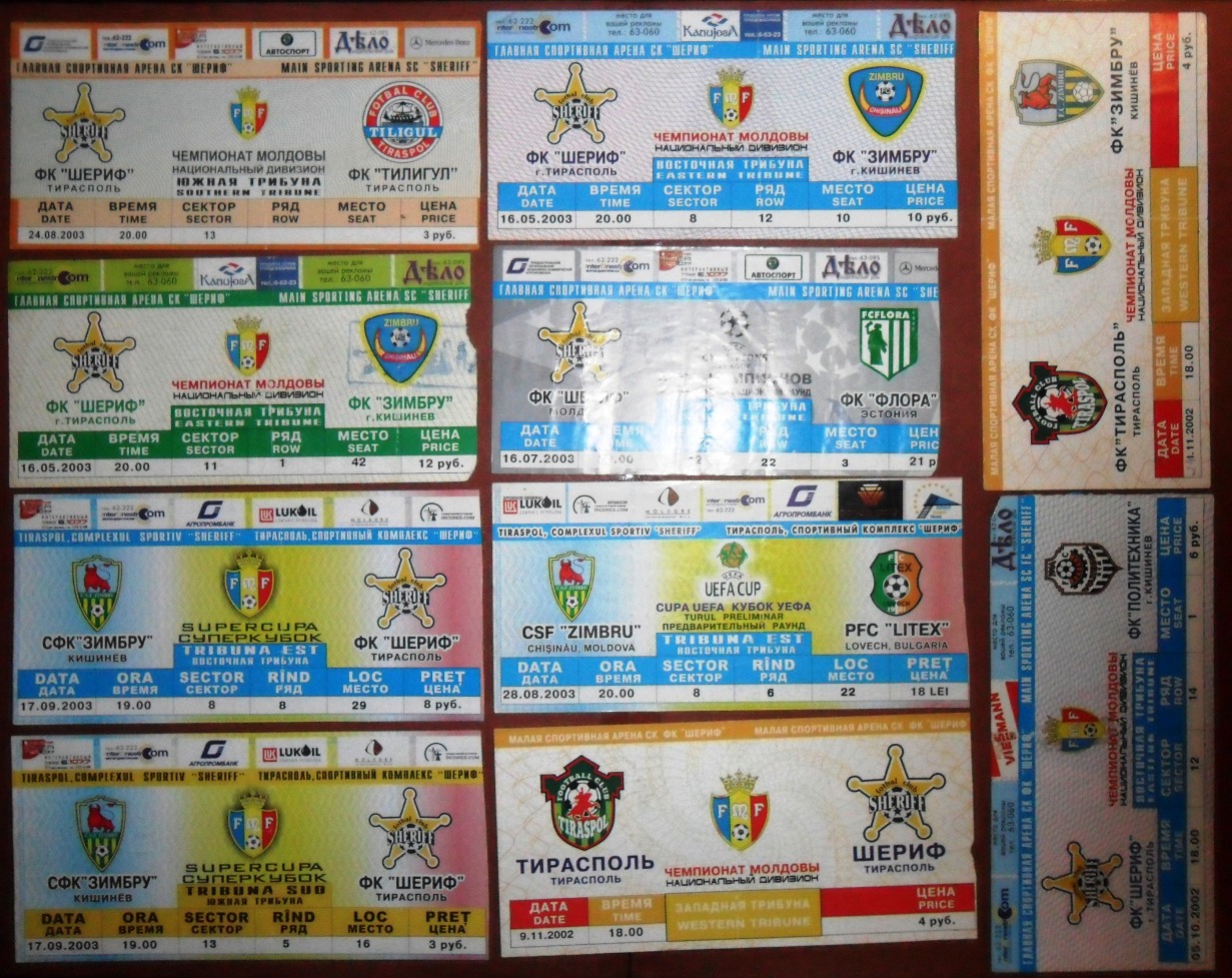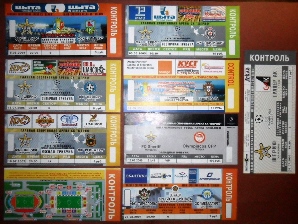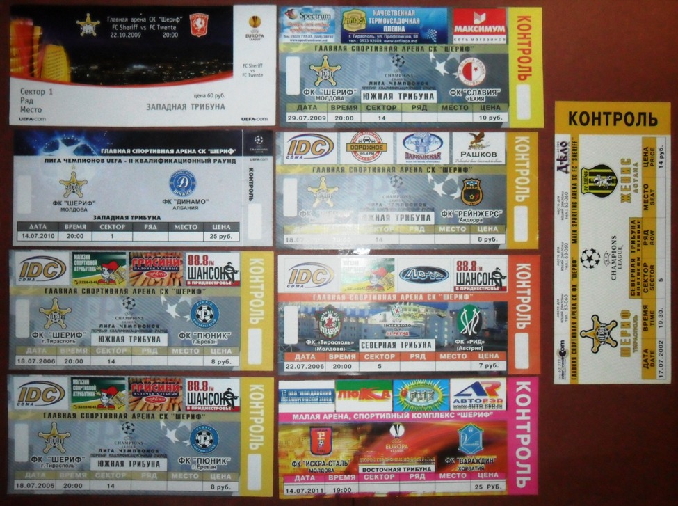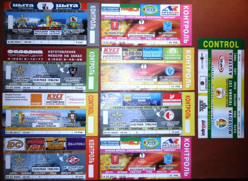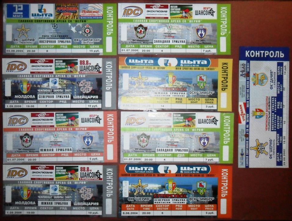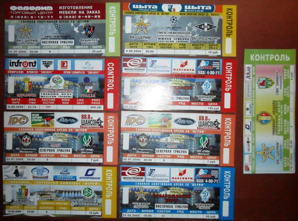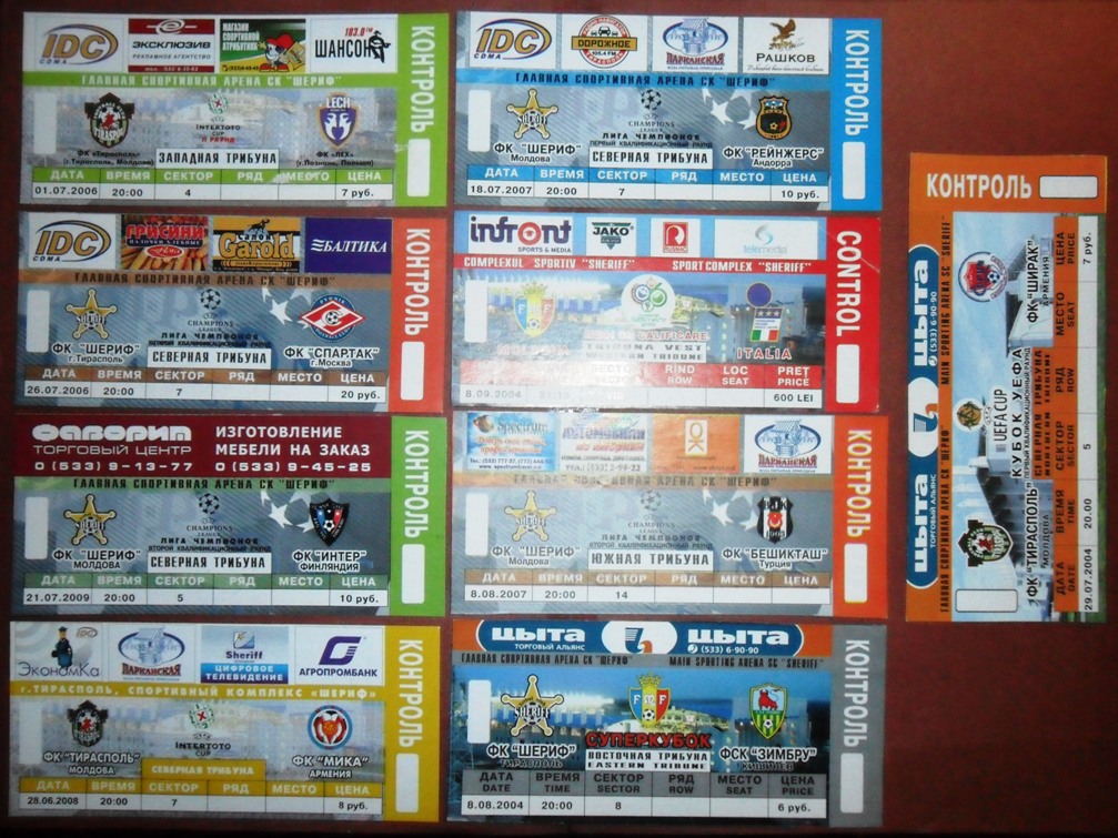 Общее количество - 366 штук + 3 пропуска для автомобилей + 23 билета на концерт. Период - с 1997 г. по 2012 г. Основная масса - местные, Тираспольские, билеты на стадион "Шериф". Хотелось бы продать всё оптом. Пересыл обойдётся где-то рублей 400-450. Предложите, если есть интерес.