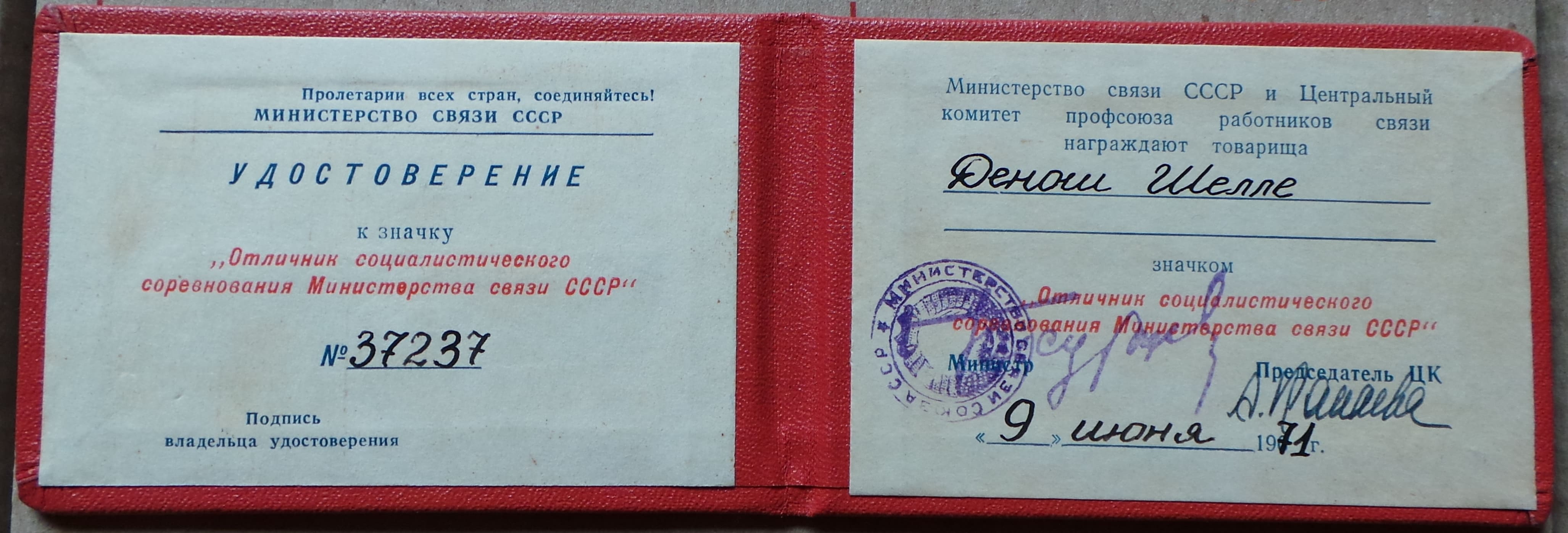 Удостоверение к значку Отличник социалистического соревнования Министерства связи СССР.