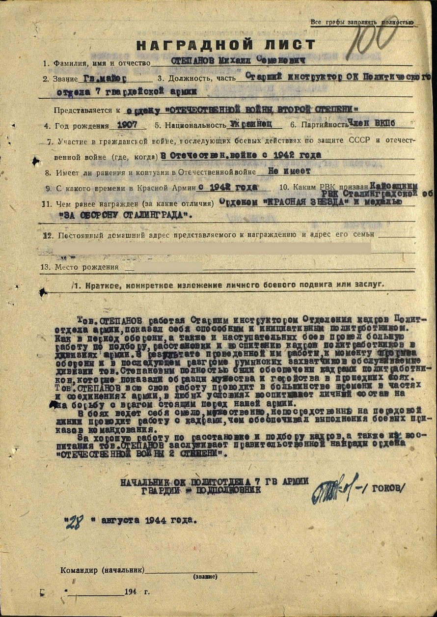 Степанов Михаил Семенович Год рождения: 08.11.1907 гв. майор в РККА с __.__.1942 года место рождения: Молдавская ССР, Тираспольский р-н, с. Красногорка