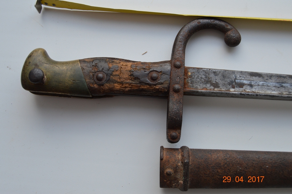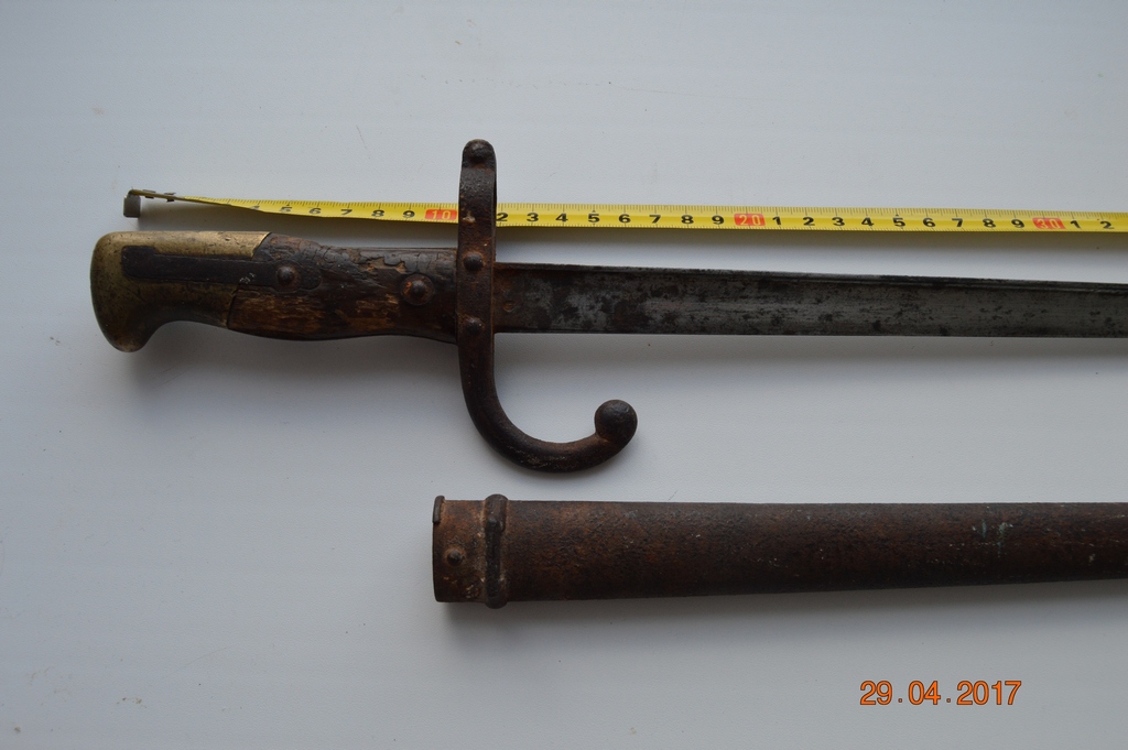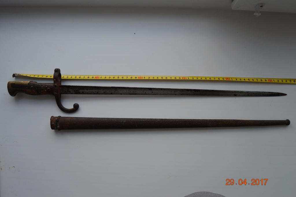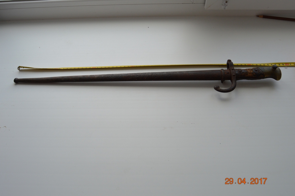 Длина штыка 64 см. Клинок Т-образный прямой. На ножнах номер видно.