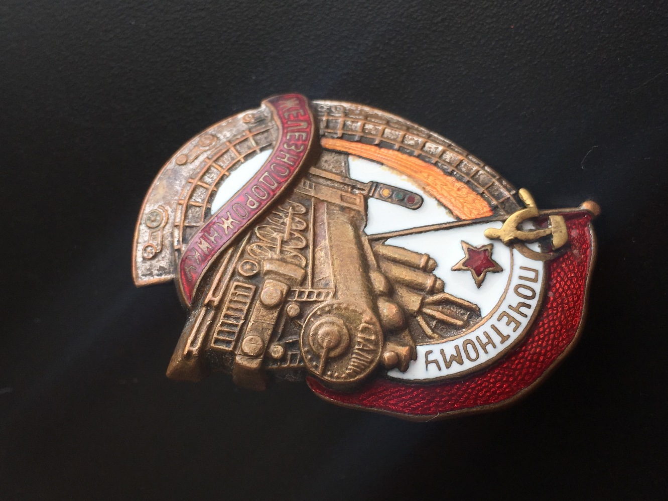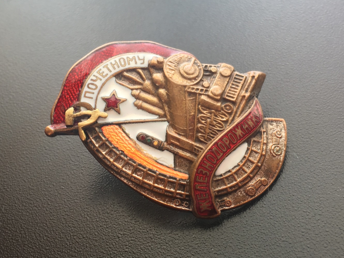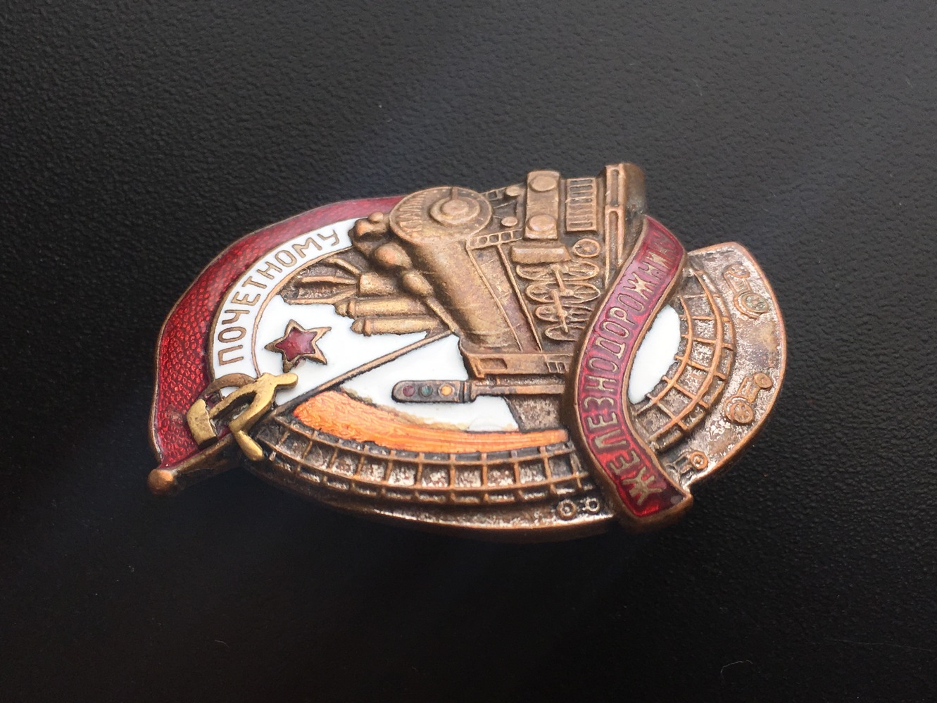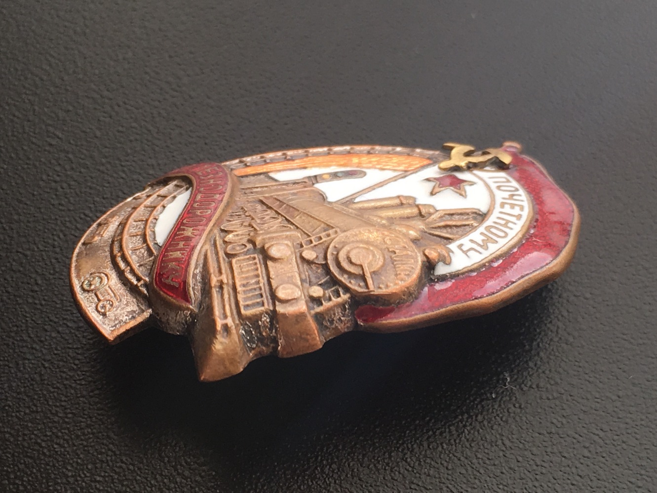 Знак Почетному железнодорожнику №13тис. Состояние: Отломана часть серпа, слева от фонаря есть поверхностная чешуя белой эмали, на фото показал. Закрутка отсутствует. Больше дефектов не обнаружил. Переходной знак 1941 года. С МПЦ сориентируюсь по ходу. Буду благодарен за предложения. Нахождение: Литва.