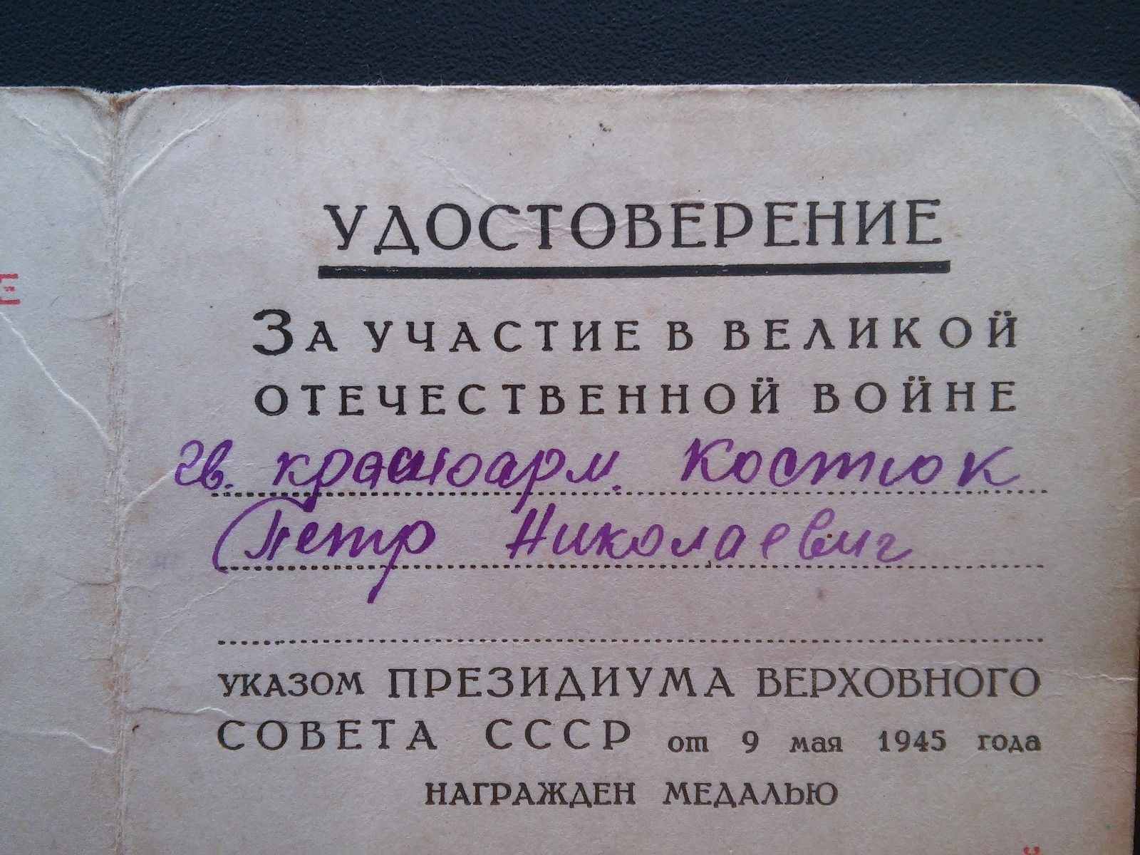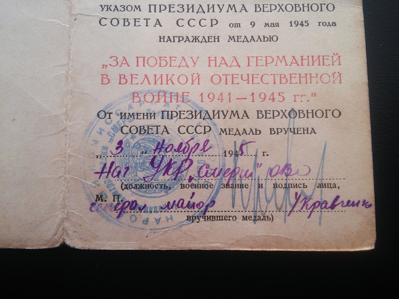 Документ к медали За победу над Германией с подписью начальника УКР СМЕРШ ОВО (управление контрразведки СМЕРШ особого военного округа) генерал-майора Кравченко. Накопал следующую информацию. УКР СМЕРШ ОВО был создан сразу после войны 9 Июля 1945 и просуществовал до 4 Февраля 1946. Центр был в Кенигсберге. Кравченко Николай возглавлял это управление в тот период. Николай Кравченко, участвовавший в предотвращении теракта против «большой тройки» в 1943 году, получил звание генерала по просьбе союзников Сталина в 1943 году. Ссылка на статью про него: http://www.trud.ru/article/10-01-2013/1 ... ralom.html