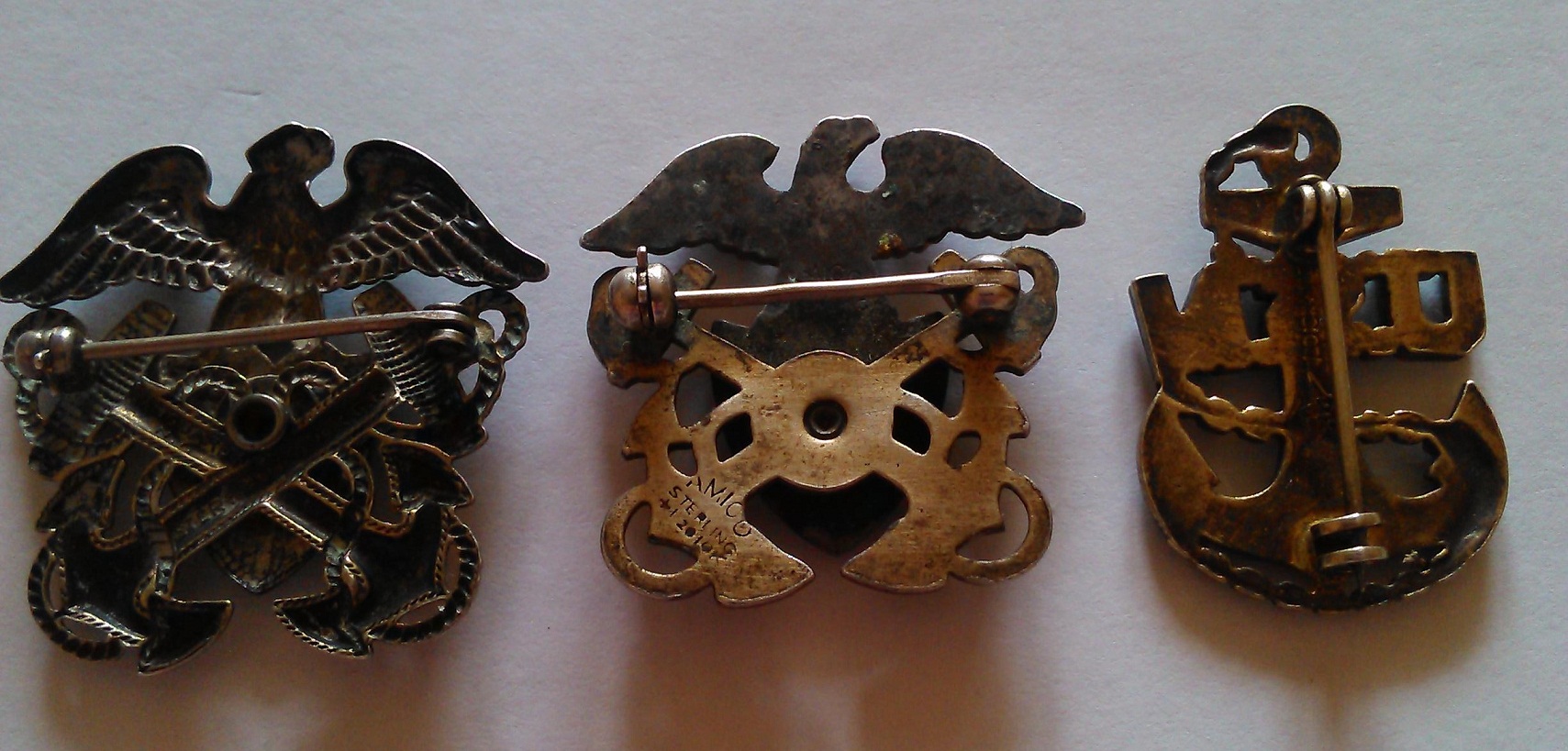 Все для ВМС . Офицерская ( два якоря) и мичманаская ( один якорь) на пилотку. Все знаки на 2 Мир. Войну + до 1950х годов. Хорошие, клеймa STERLING, что значит серебро + покрыты 1/20 карат.золотом.