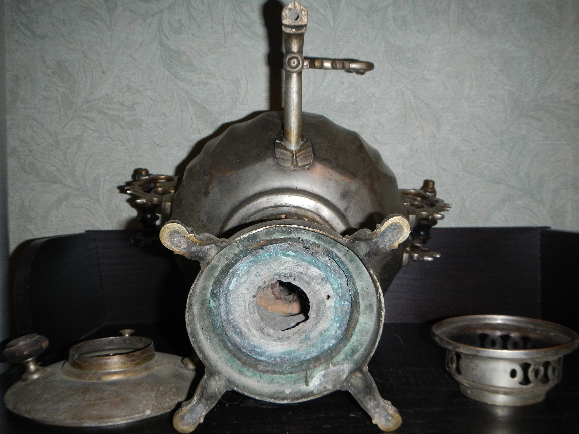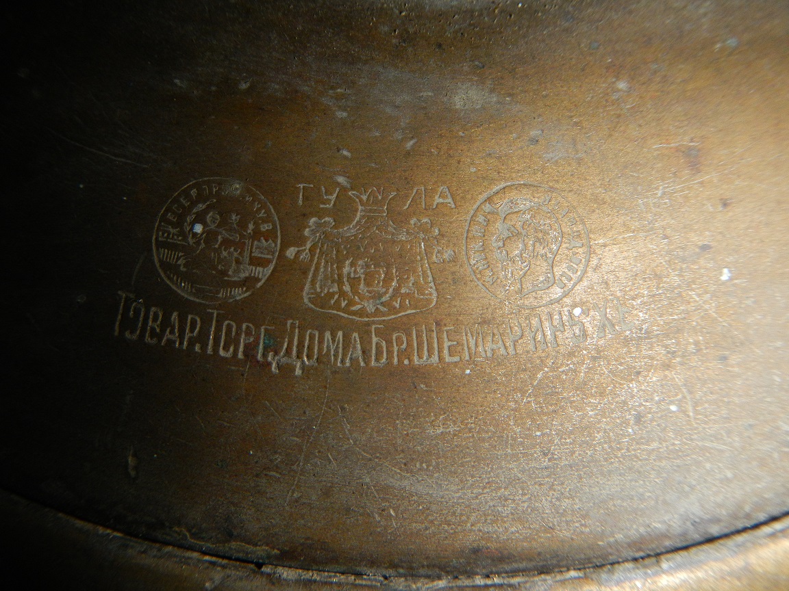 Весьма редкий самовар фабрики Бр. Шемариныхъ. Объем 4 литра (с запасом), высота с конфоркой 38,5 см. Имеются вмятины, трещинки. Клеймо на крышке четкое, не затертое. Нуждается в руках хорошего, умелого мастера. Цена 35 тыс. руб.