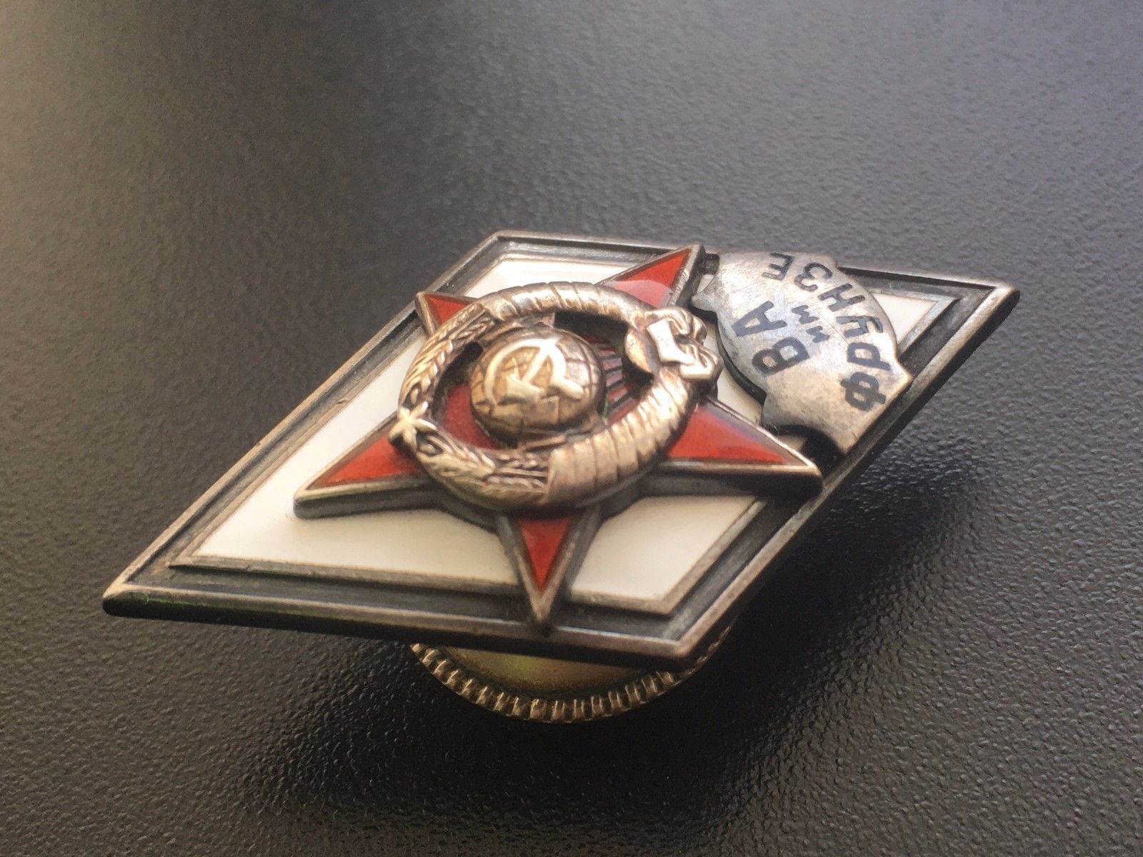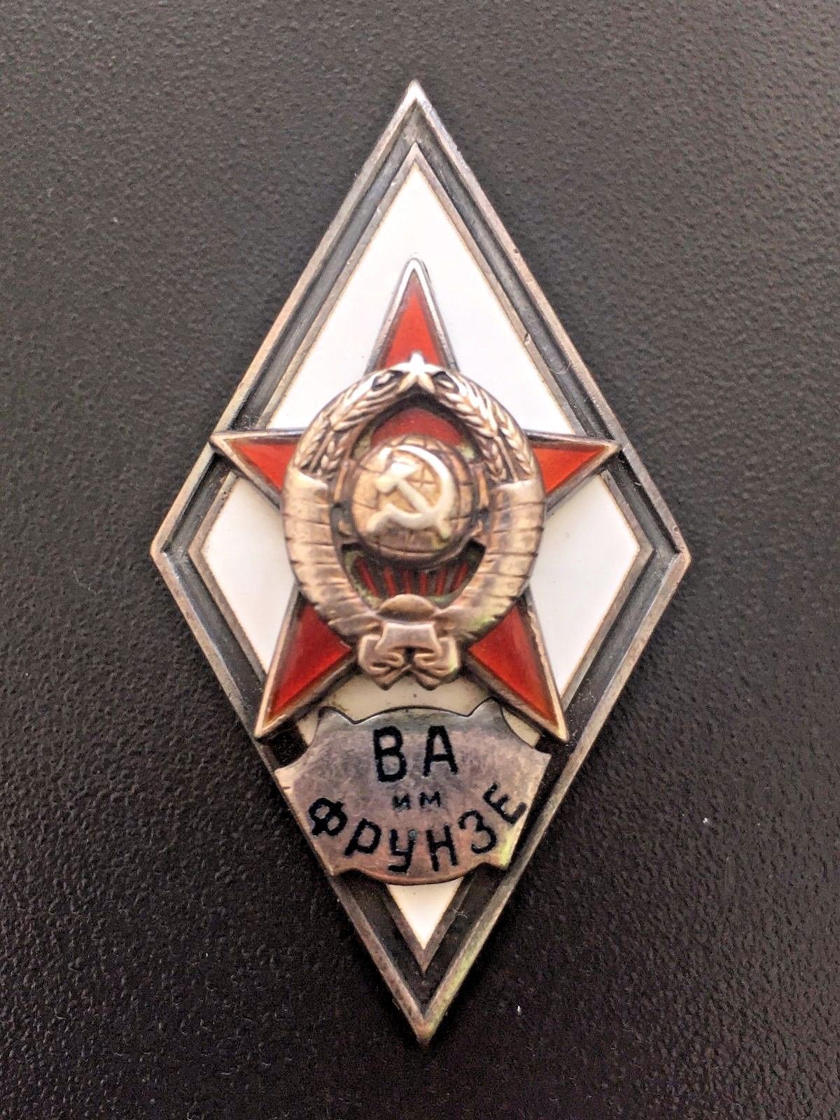 Ромб ВА им. Фрунзе серебряный 2й тип. Состояние: без повреждений, сколов, чешуй не обнаружил. Резьба\гайка в отличном состоянии. С МПЦ по ходу. Буду благодарен за предложения. Доставка по миру: 5дол. Просьба ставки также делать в дол.