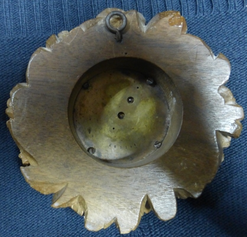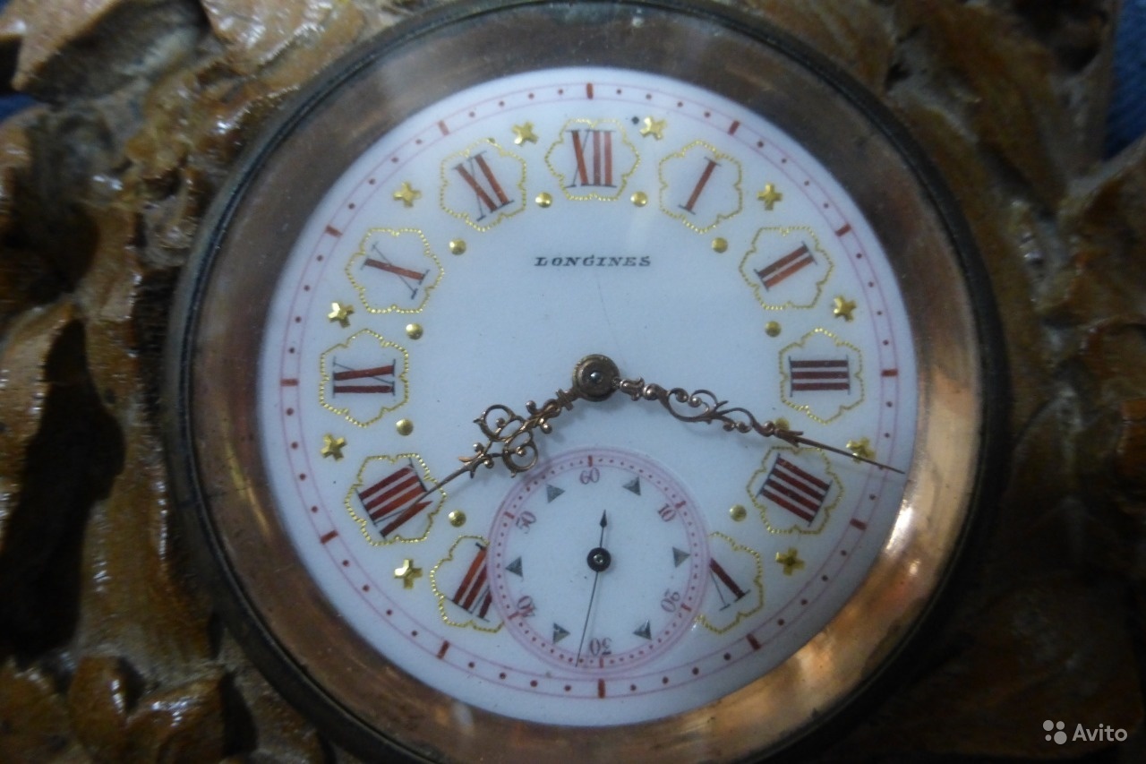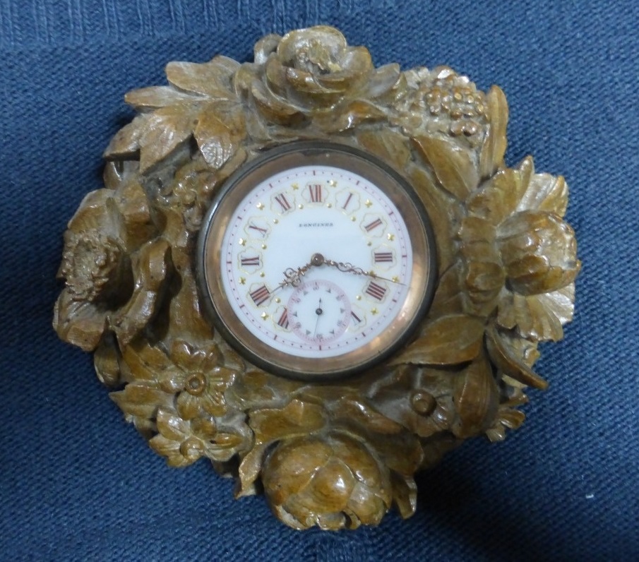 Часы. Швейцария. Ланжин. Довоеннные. На ходу. Нет ключа. Резной деревянные корпус. Диаметр корпуса 12 см. Диаметр часов 5 см.