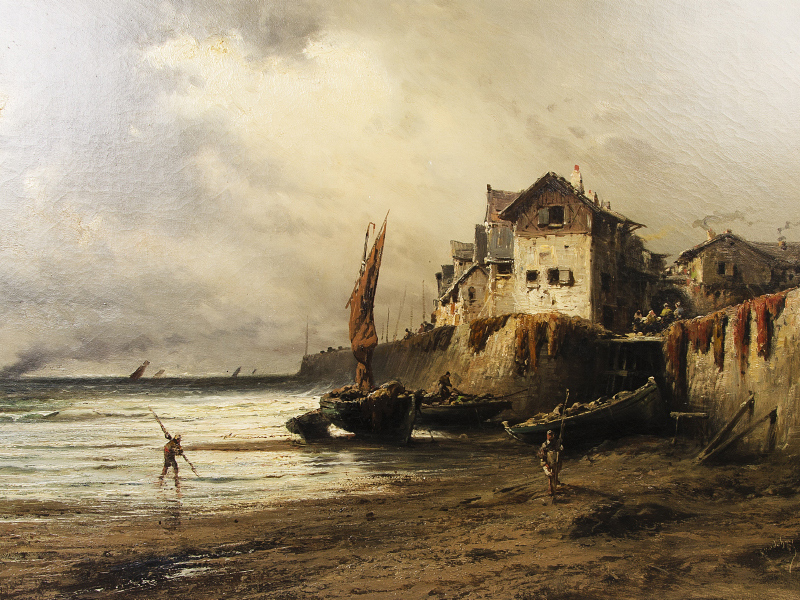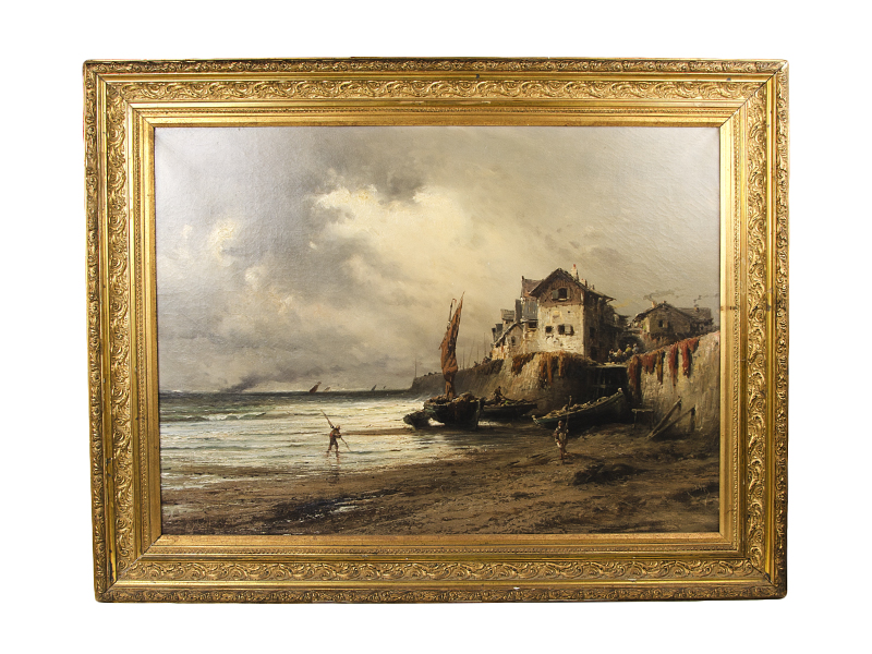 Картина "Рыбацкая деревня". Холст. Масло. Сер. XIX века.