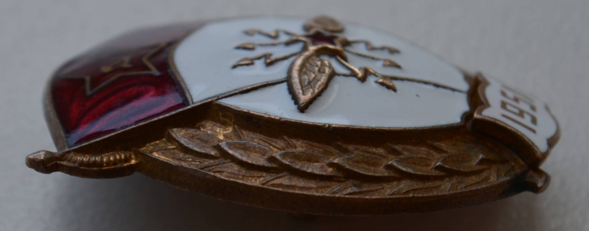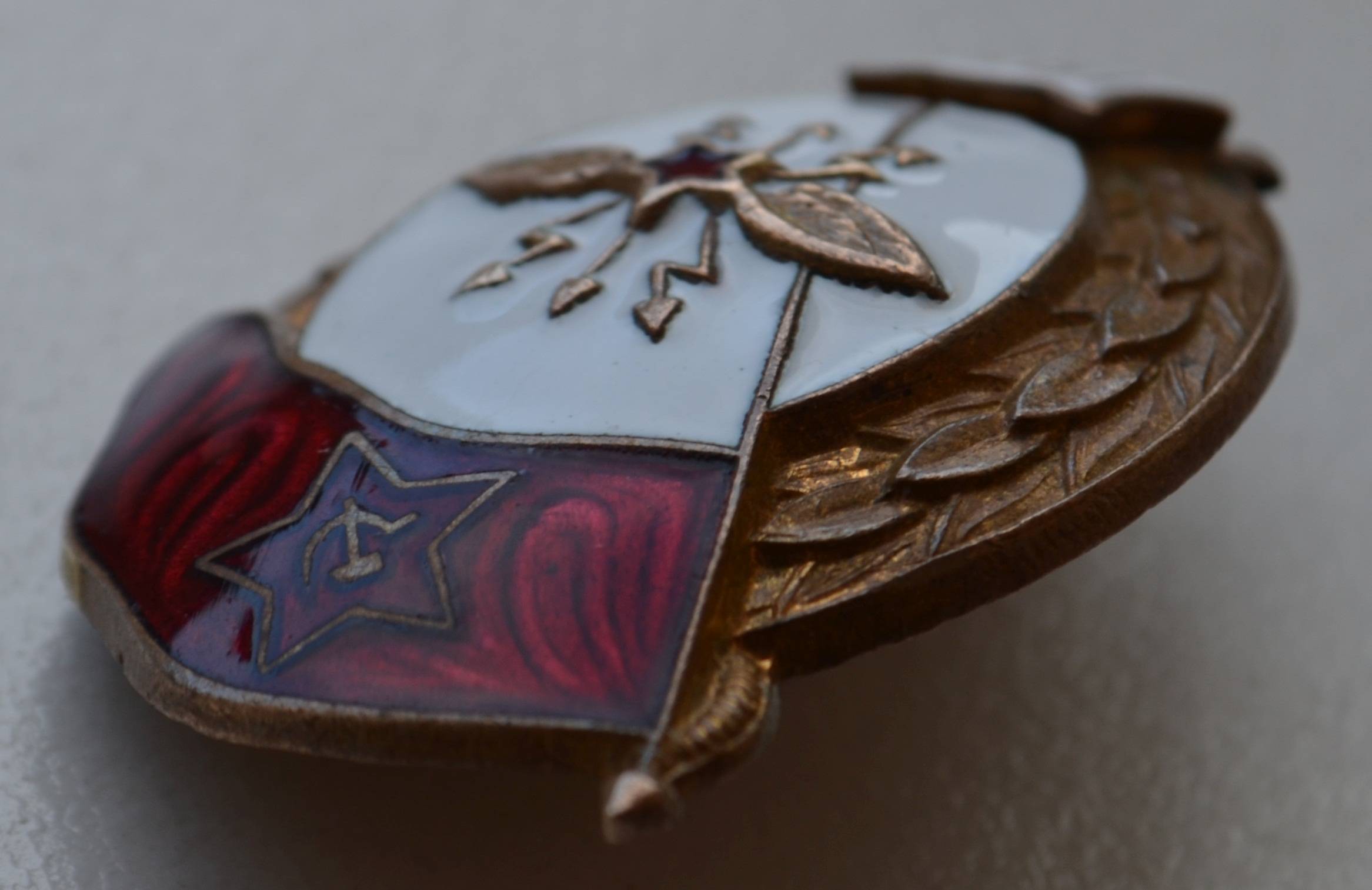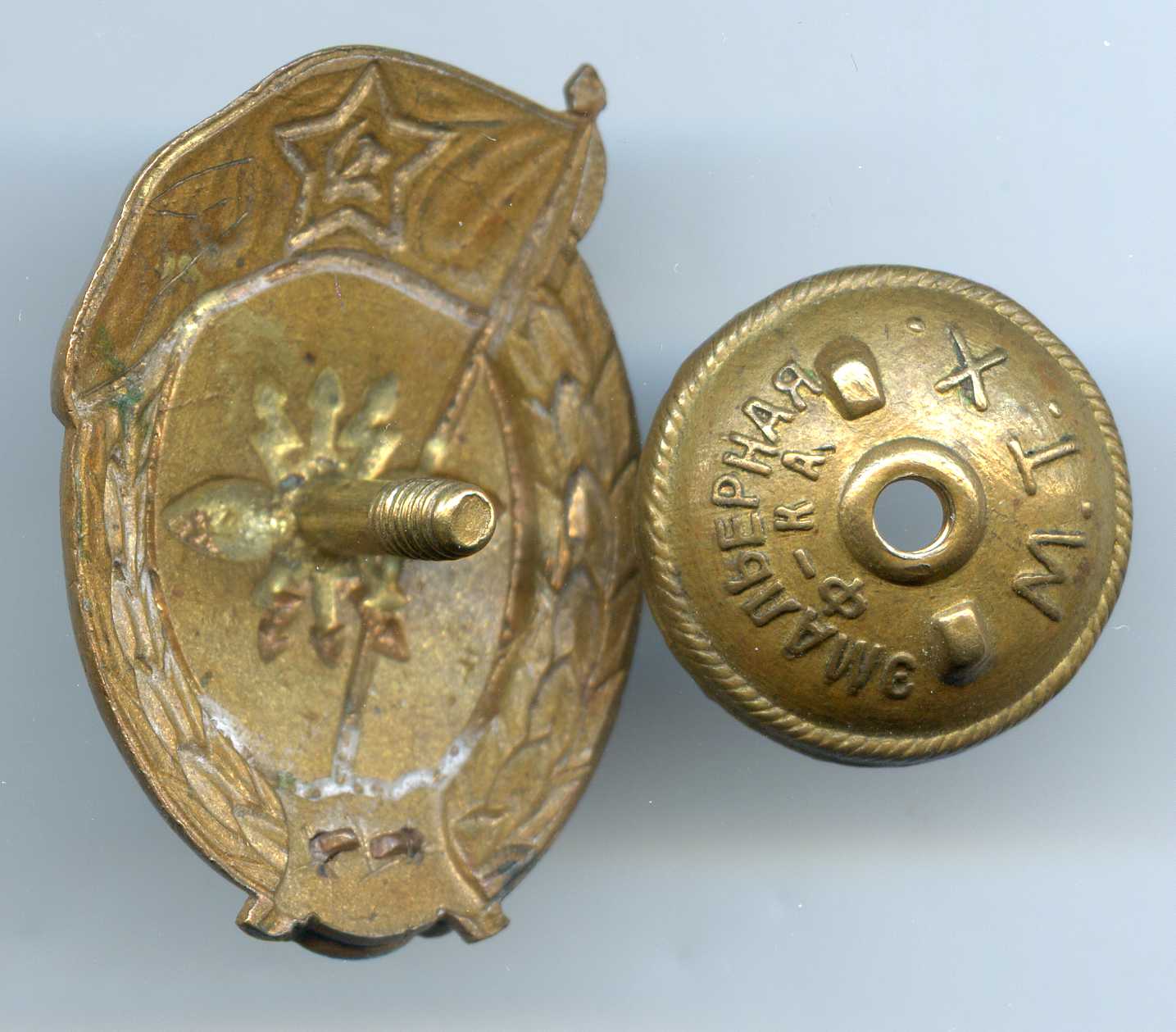 Мне знак нравится. Знак исполнен методом штамповки. На нем присутствует фирменная пайка и винт МТХ, характерный для МТХ способ подрезания усов у шильды, остатки позолоты.