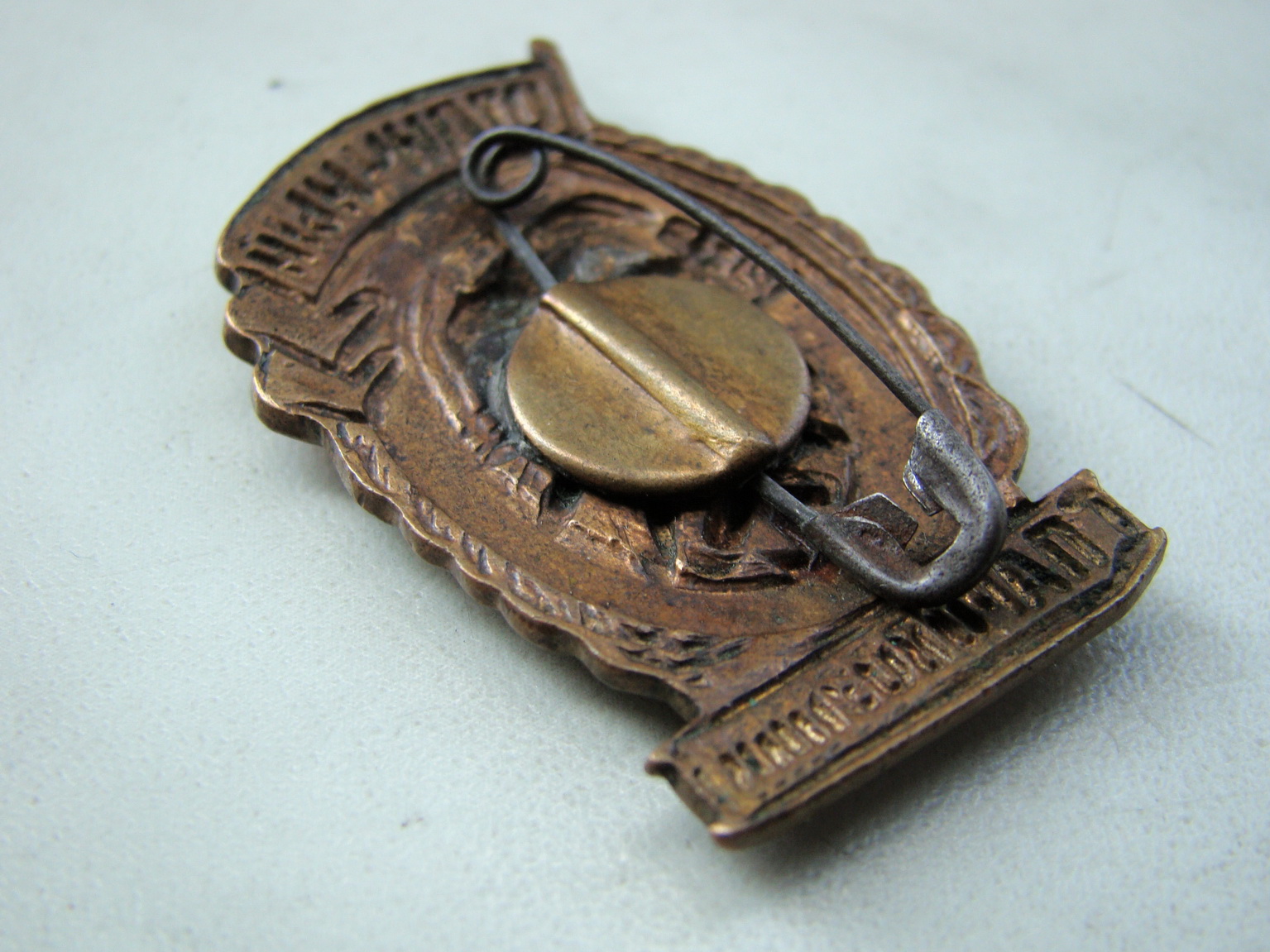 На реверсе, для крепления к одежде, булавка.