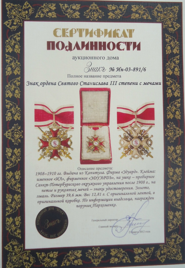 Орден Станислава 3 степени с мечами золото.