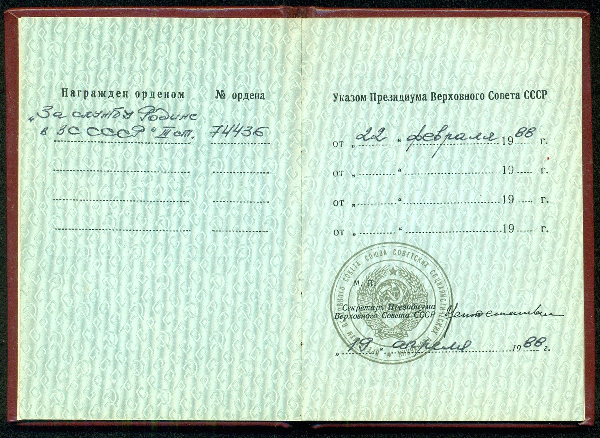 Участвовал в 4 боевых действиях по уничтожению бандформирований в пр. Балх, Фарьяб продолжительностью 61 сутки, проявляя мужество, умение действовать в сложной обстановке. Материальную часть и вооружение боевой техники знает, умело обучает подсоветных правильно организовывать ее эксплуатацию, ремонт и хранение. Проявляет полезную инициативу по совершенствованию мат. тех базы. Особое внимание уделяет вопросам поддержания техники и вооружения полка в постоянной боевой готовности..."Торги до завтра, 22.00 по Москве