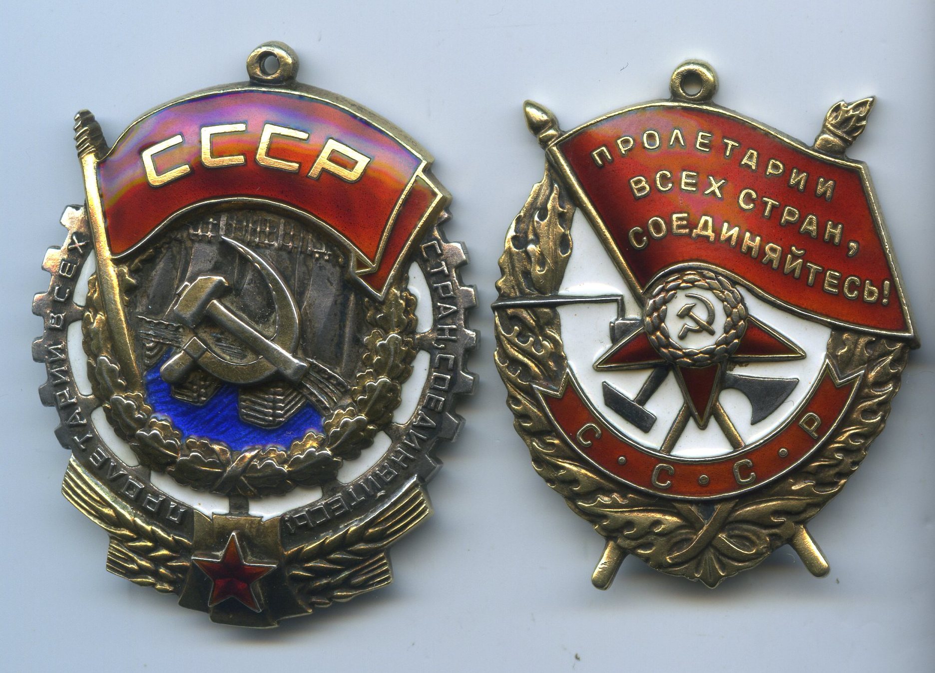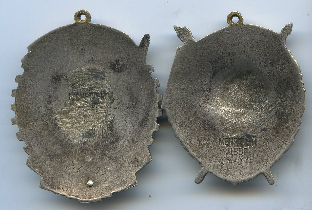Эмаль в люксе на обоих знаках, кавалер носил ордена на самодельных припаянных винтах. Винты и припой убраны.