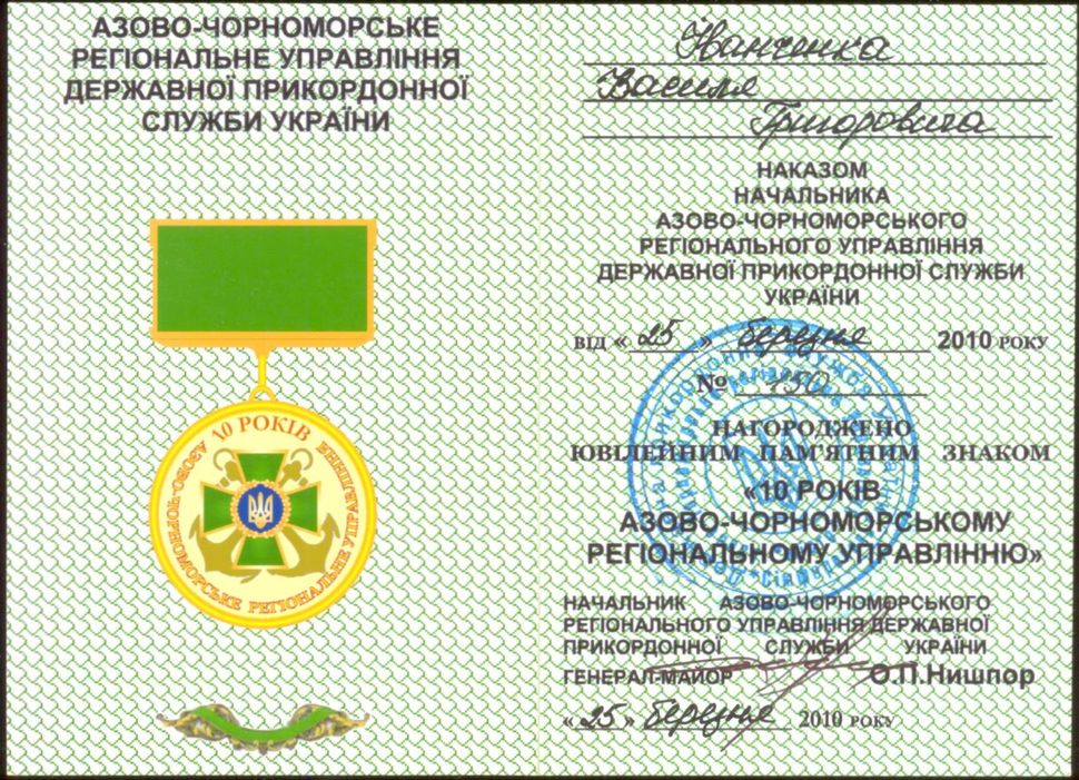 К продаже предлагается - Медаль 10 рокiв Азово-Чорноморське регiональне управлiння с документом на Пограничника Иванченко Василия Григорьевича.
