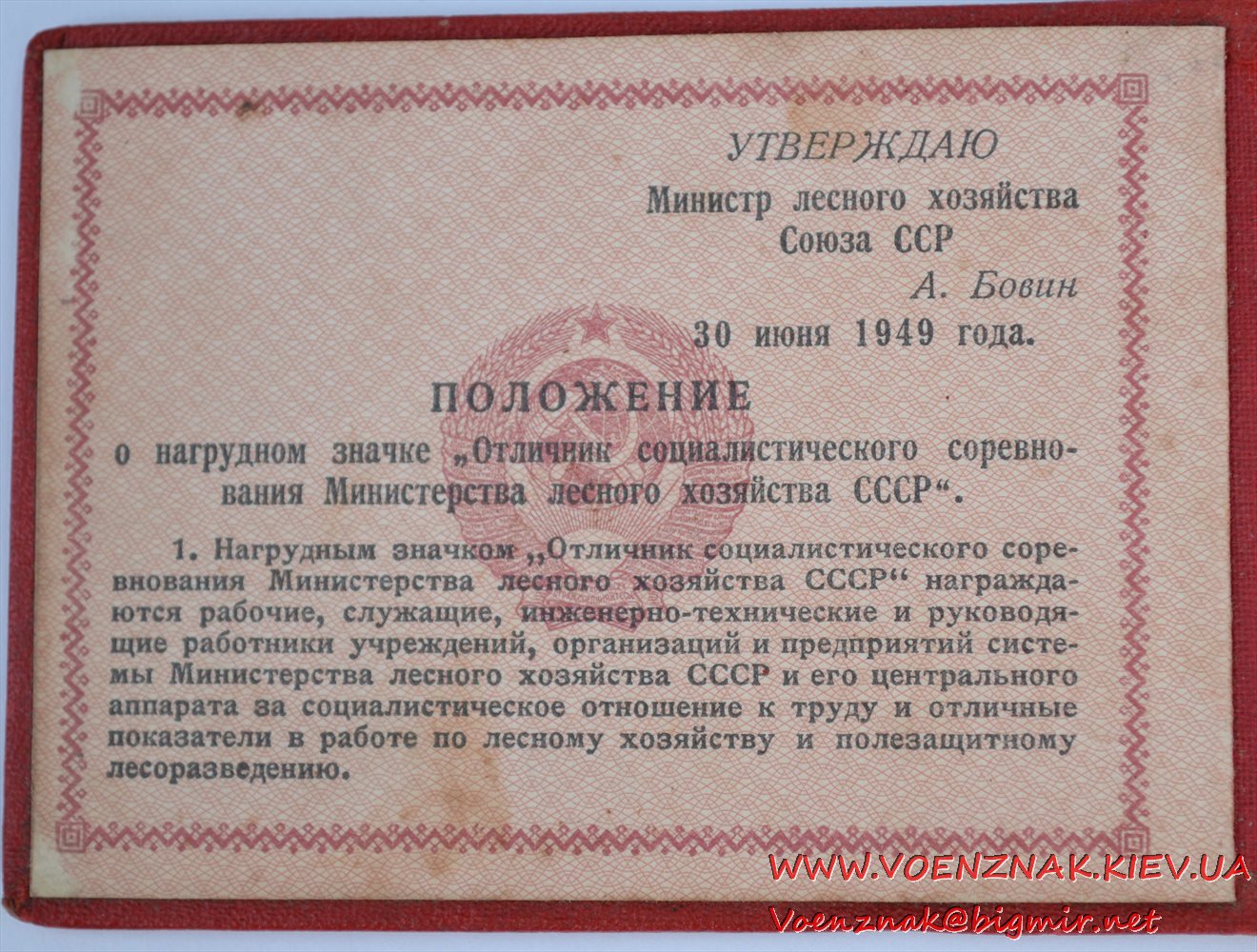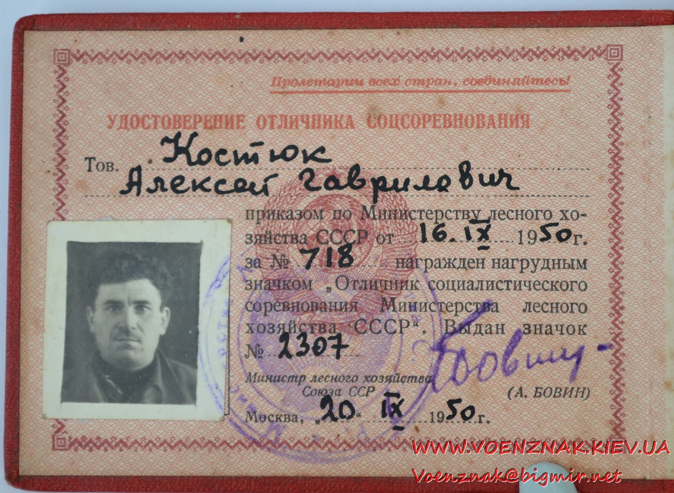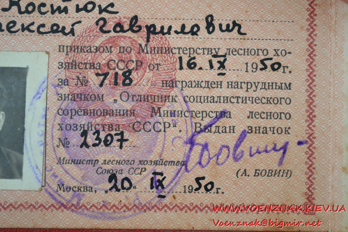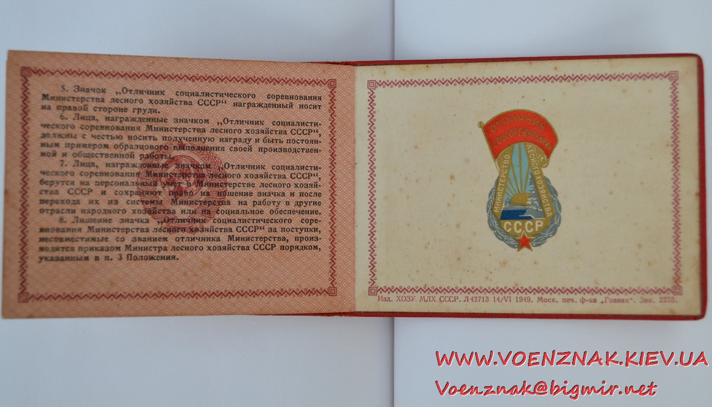 Документ к знаку "Отличник соцсоревнования Министерства лесного хозяйства СССР" № 2307