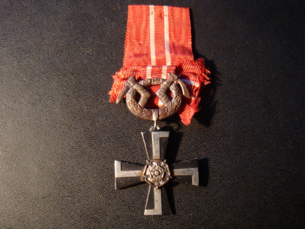 Орден Креста Свободы 3-го класса 1918 года. Белый металл, 37x62 мм. На красной ленте с двумя белыми полосами.