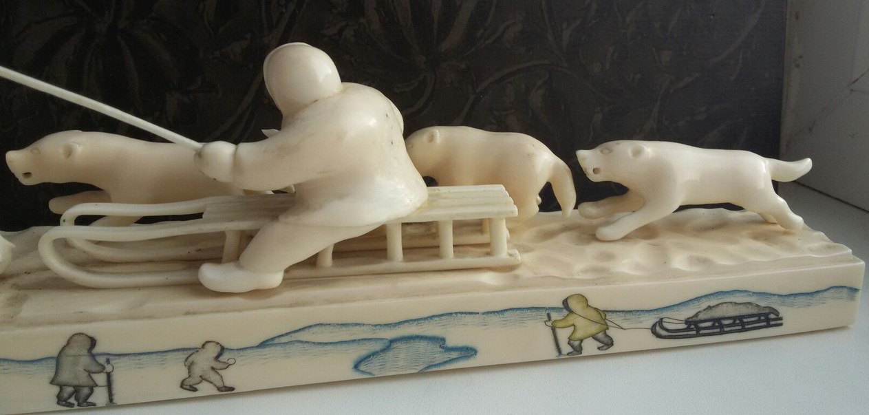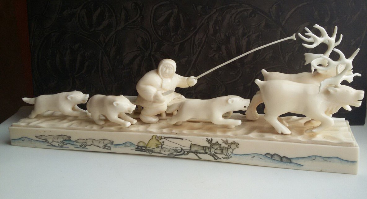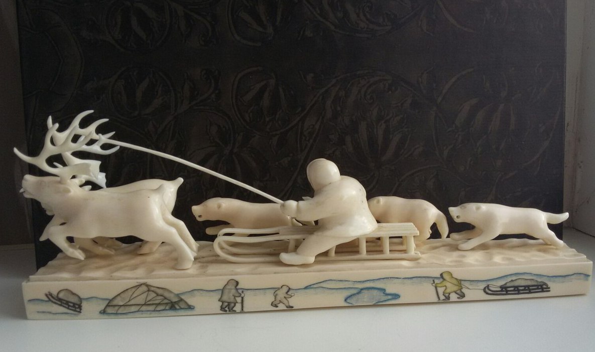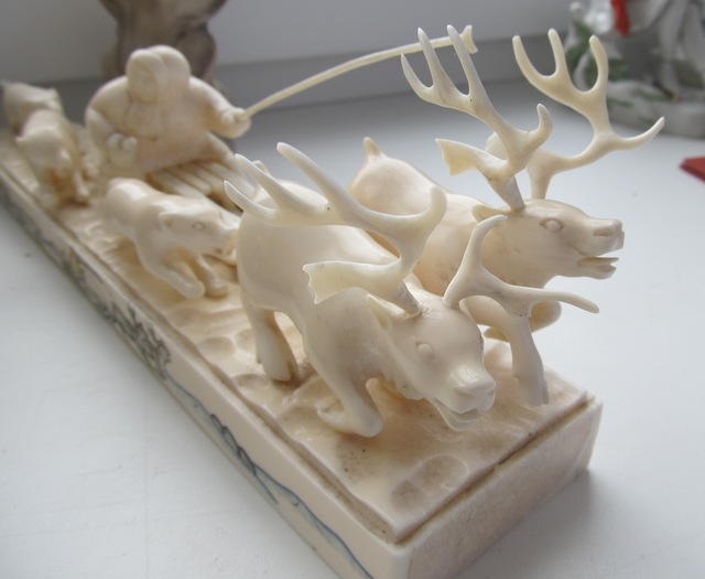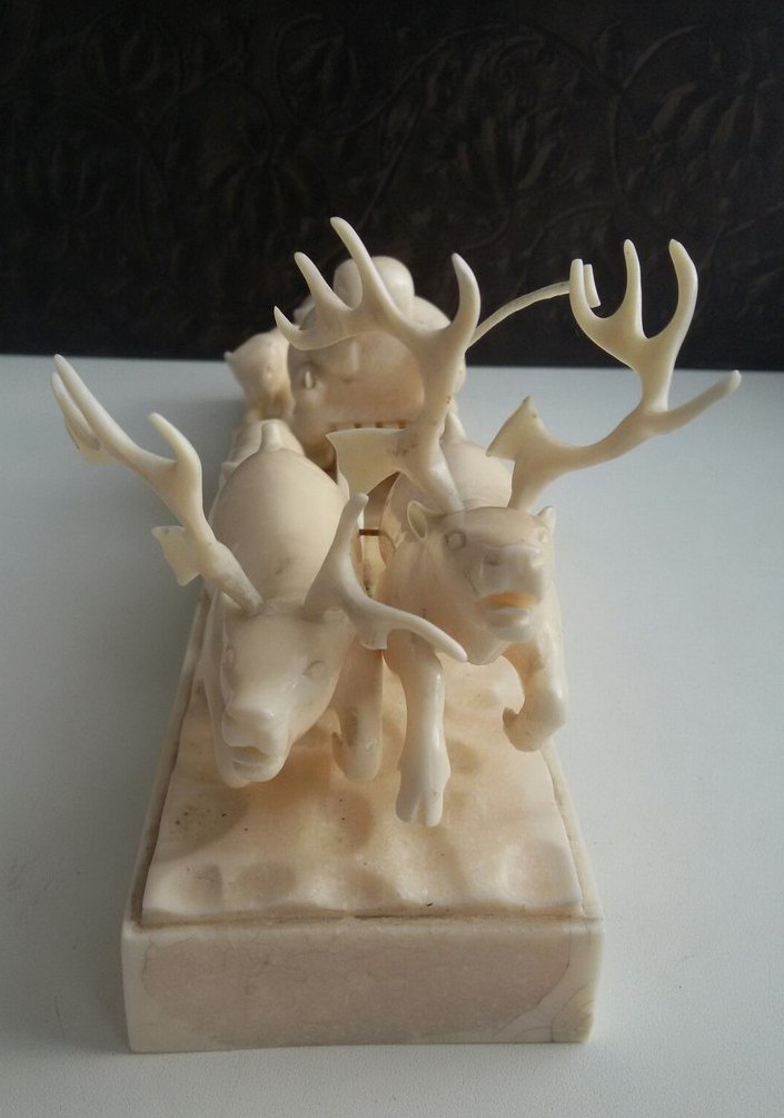 Упряжка-950гр,30см.Подпись-м-р.Игнатовский А.В.,Уэлен,1985г,цена 315руб,гравер Виктория Тагьёк, науканская эскимоска, опытный гравер, а также замечательная исполнительница старинных эскимосских танцев.)два рога вынимаются,один-нет и один рог меньше.