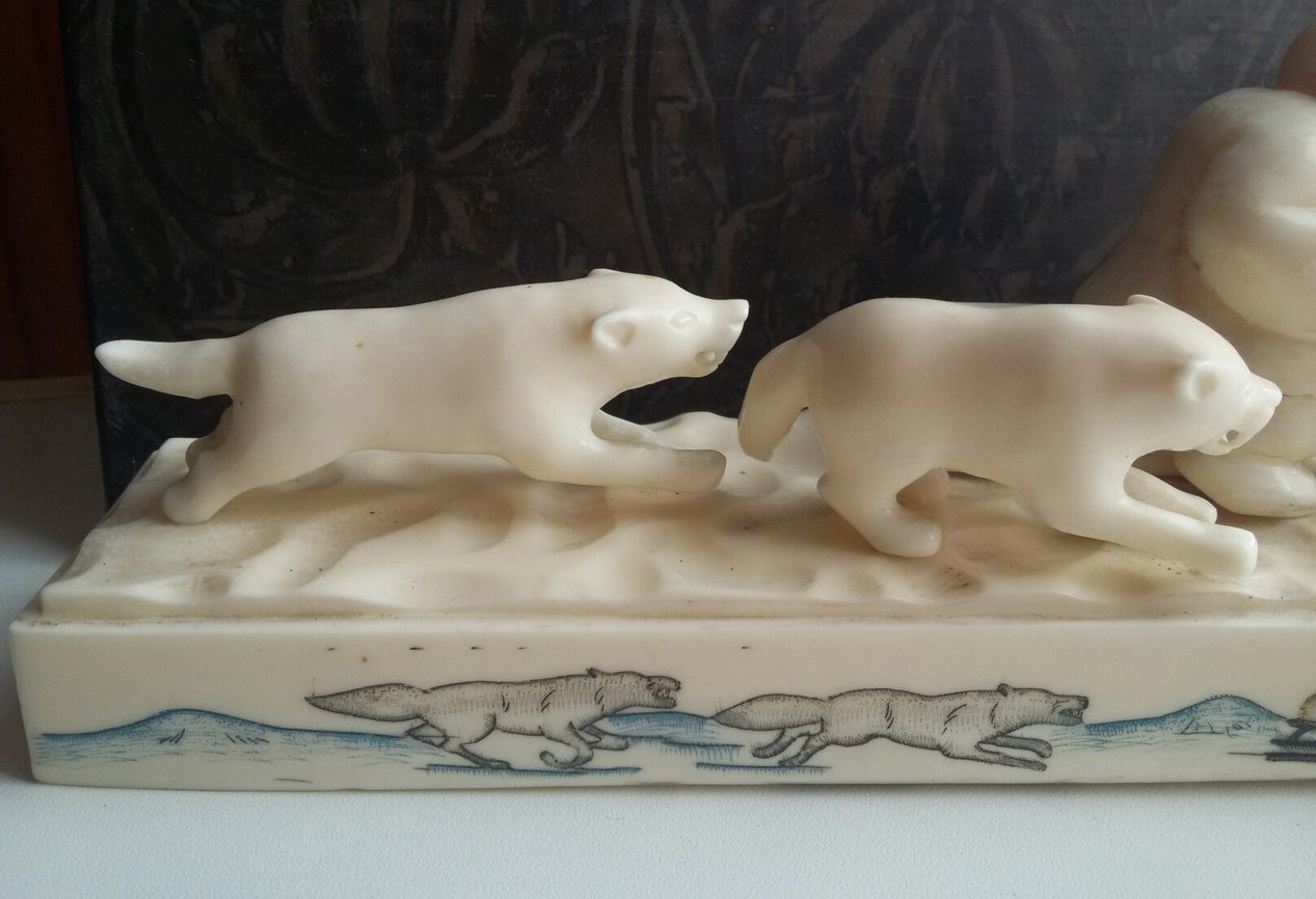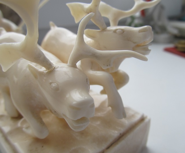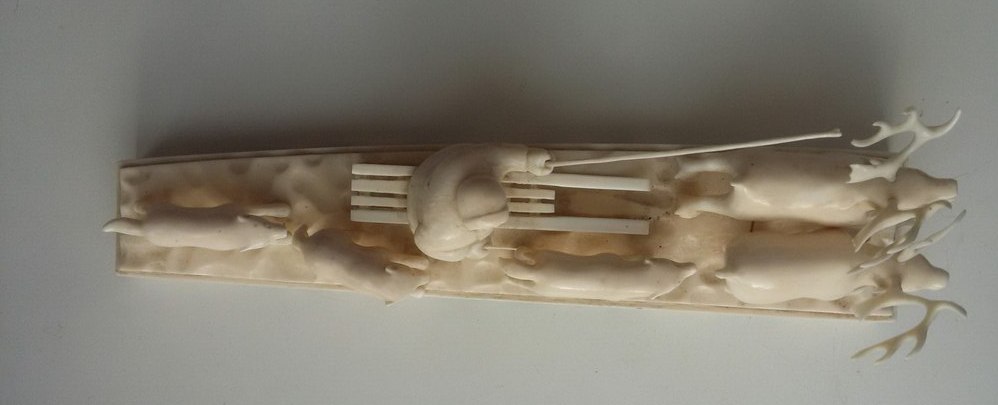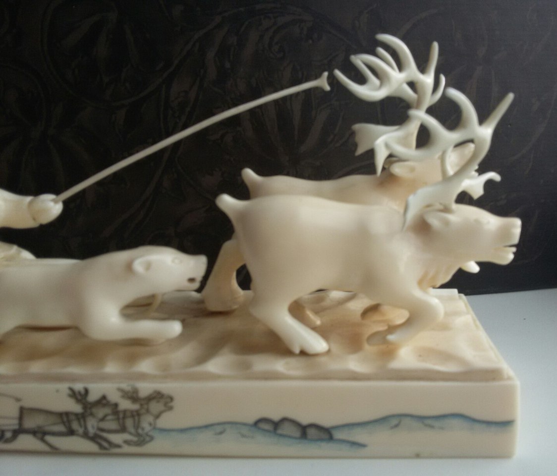 Упряжка-950гр,30см.Подпись-м-р.Игнатовский А.В.,Уэлен,1985г,цена 315руб,гравер Виктория Тагьёк, науканская эскимоска, опытный гравер, а также замечательная исполнительница старинных эскимосских танцев.)два рога вынимаются,один-нет и один рог меньше.