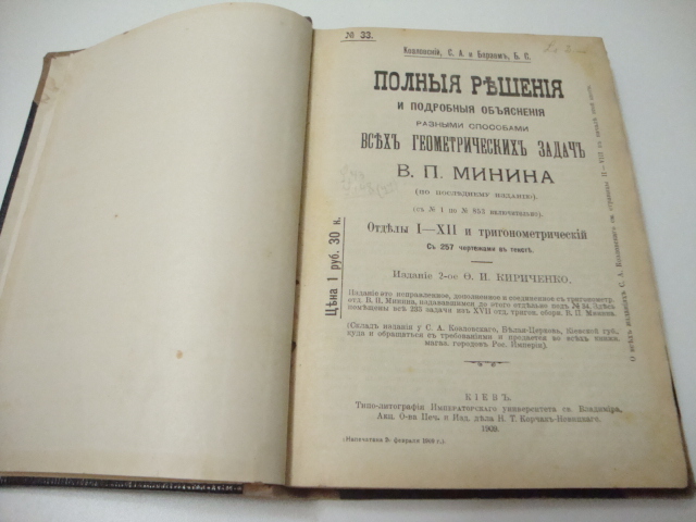 № 33. Козловский С.А., Барзам Б. С. Полные решения и подробные объяснение разными способами всех геометрических задач В. П. Минина. Отделы I-XII и тригонометрический. С 257 чертежами в тексте. Изд 2-ое Ф. И. Кириченко. Киев. Тип. Императорского университета св. Владимира. 1909г. 245стр.