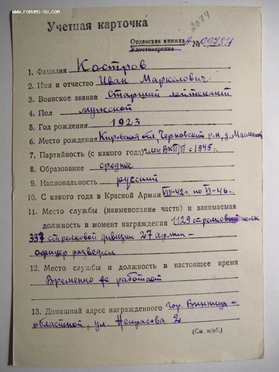 archibald писал(а):Когда же он стал офицером разведки, если все награды будучи на ком. пулеметного взвода и роты сп? УПК случайно нет? Жаль ОК нет, или будет?