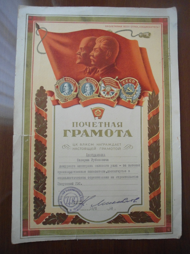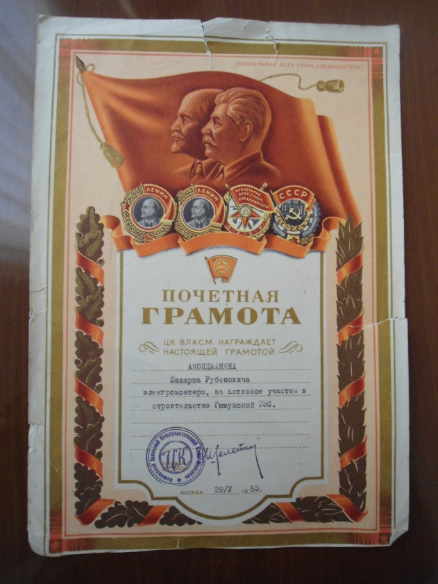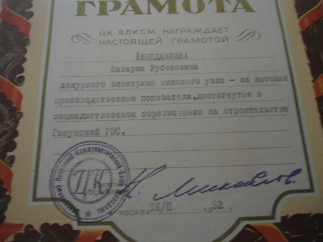 За высокие производственные показатели, достигнутые в соц. соревновании на строителсьстве ГЮМУШСКОЙ ГЭС.