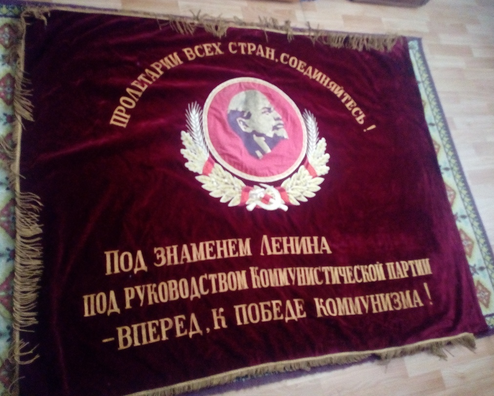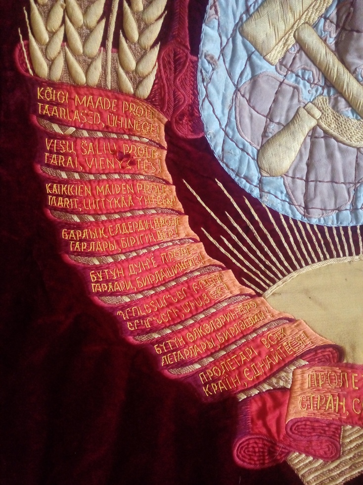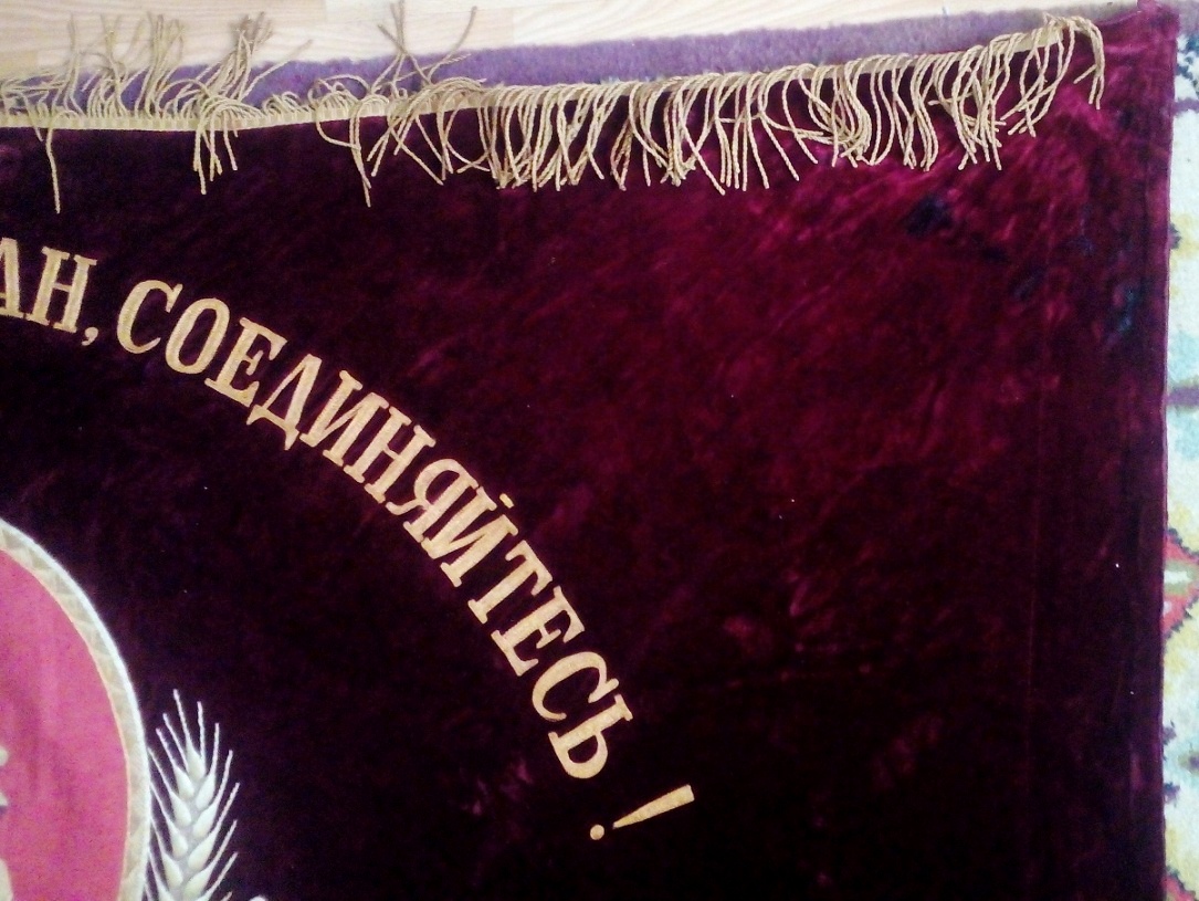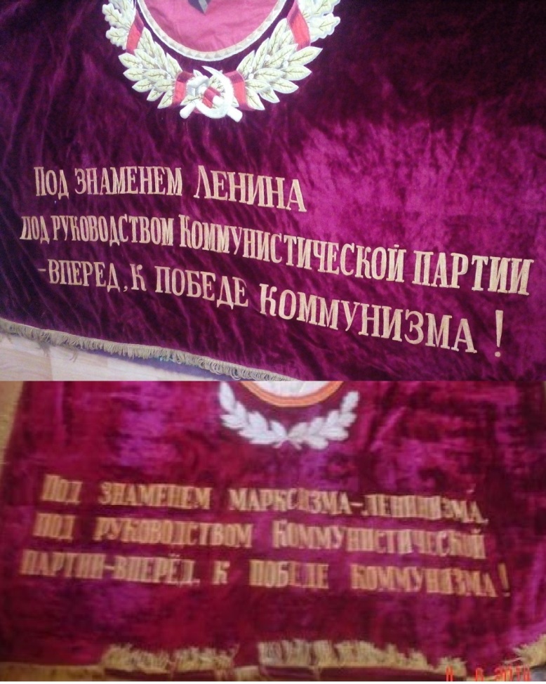 В надписи "Под знаменем Ленина - Сталина под руководством КП - вперед к победе коммунизма!" слово СТАЛИНА удалено. Ниточки аккуратно выдернуты, но след явственно остался