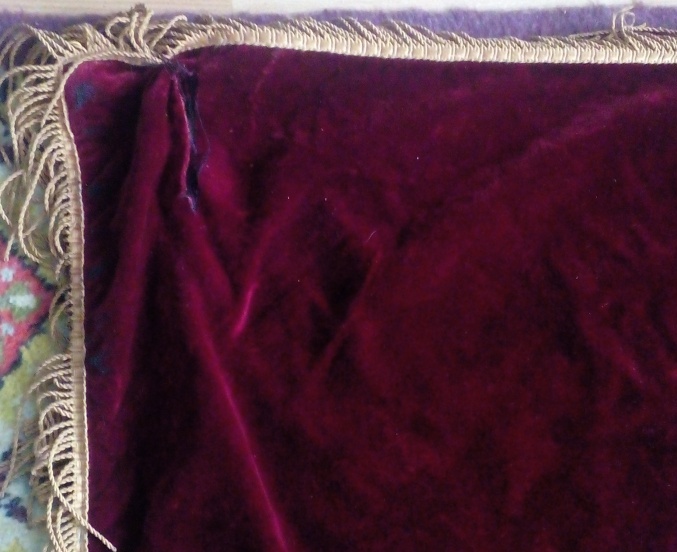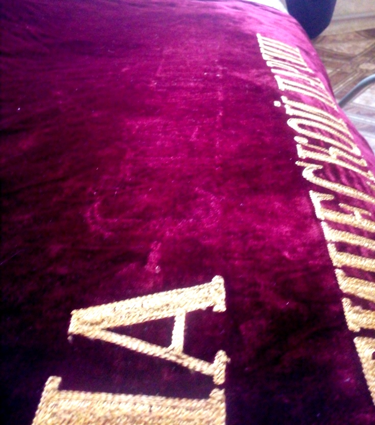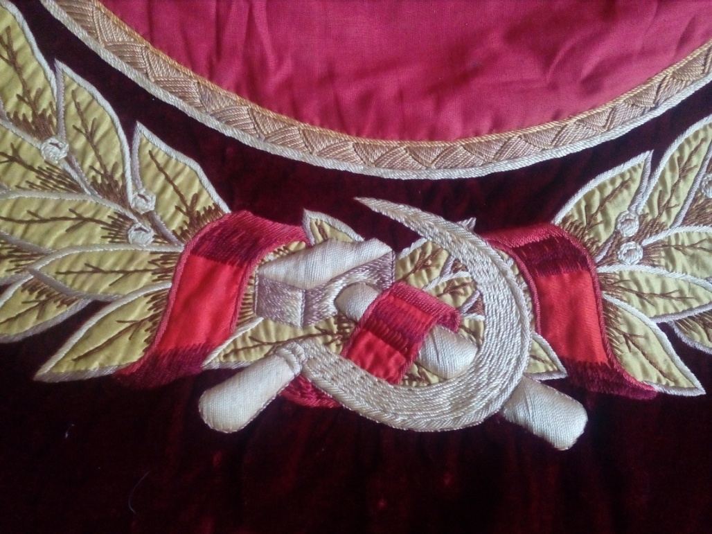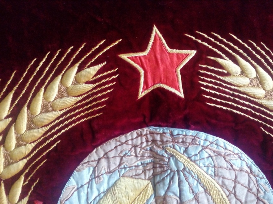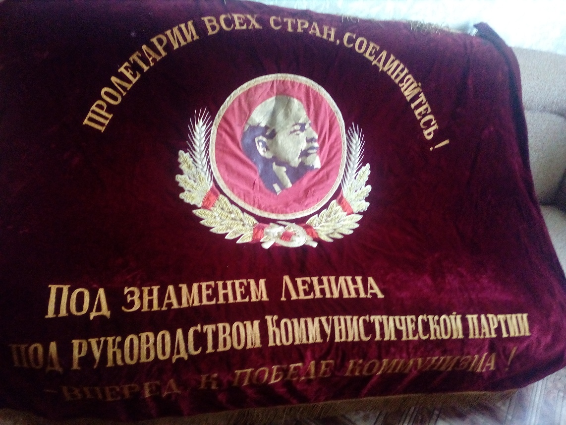 В надписи "Под знаменем Ленина - Сталина под руководством КП - вперед к победе коммунизма!" слово СТАЛИНА удалено. Ниточки аккуратно выдернуты, но след явственно остался