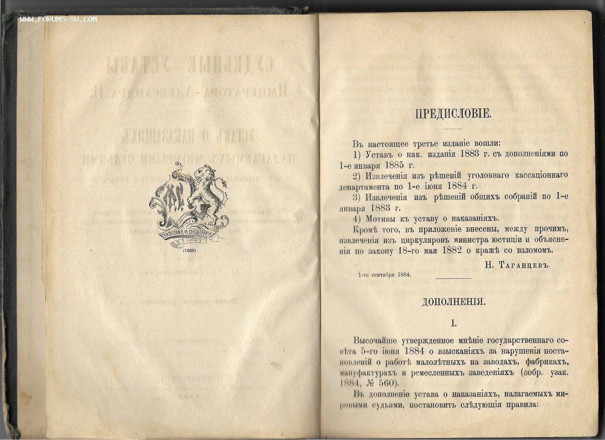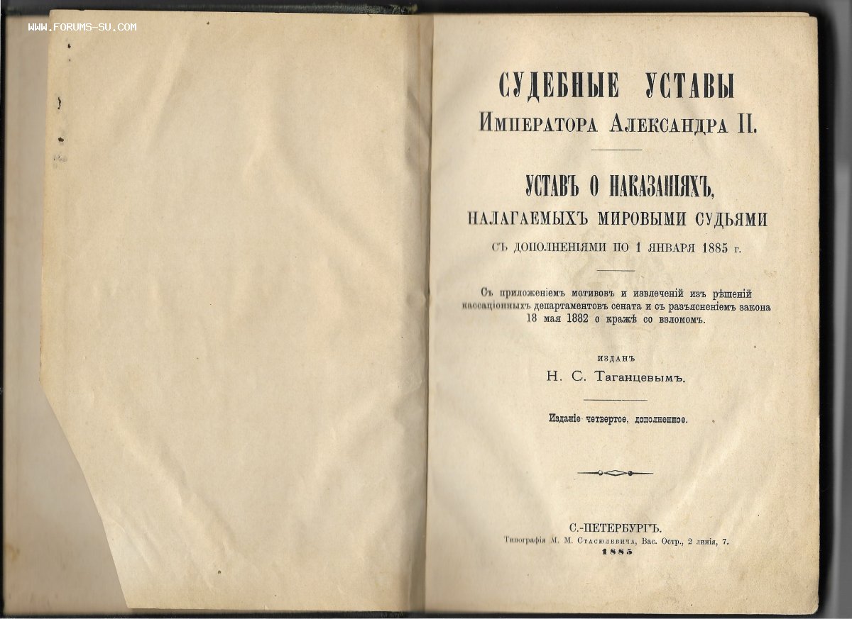 Устав о наказаниях, налагаемых мировыми судьями : С доп. по 1 янв. 1885 г. : С прил. мотивов и извлеч. из решений кассац. деп. Сената и с разъясн. закона 18 мая 1882 о краже со взломом / Изд. Н.С. Таганцевым. - 4-е изд., доп. - Санкт-Петербург : тип. М. Стасюлевича, 1885г. - V, 382 стр .; (Судебные уставы императора Александра II).