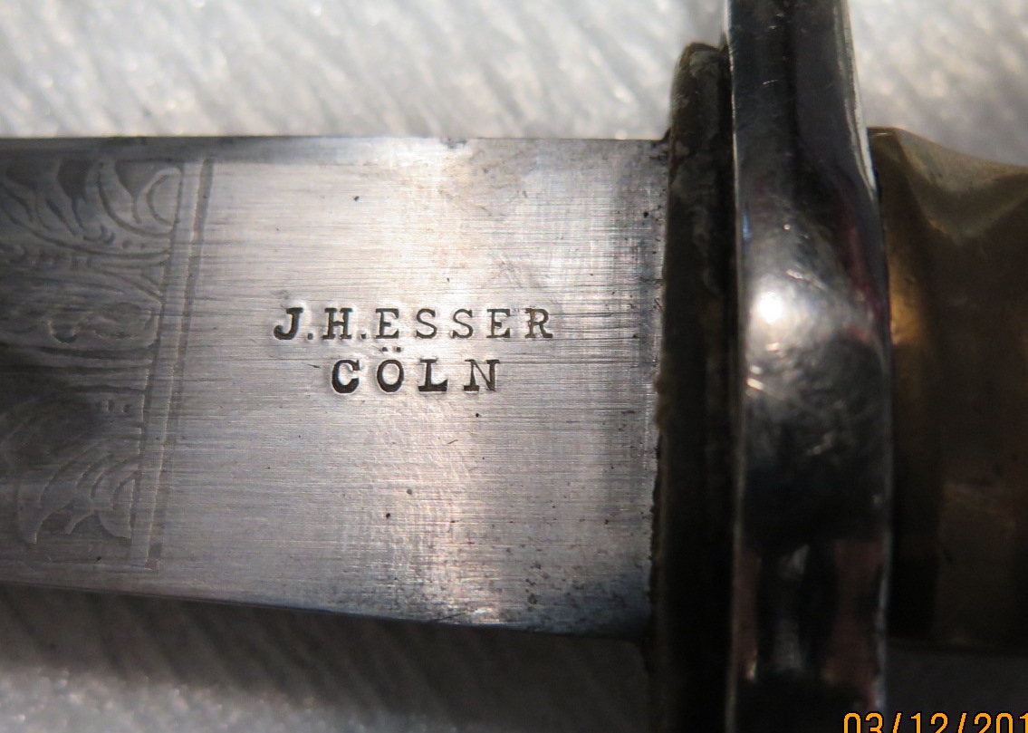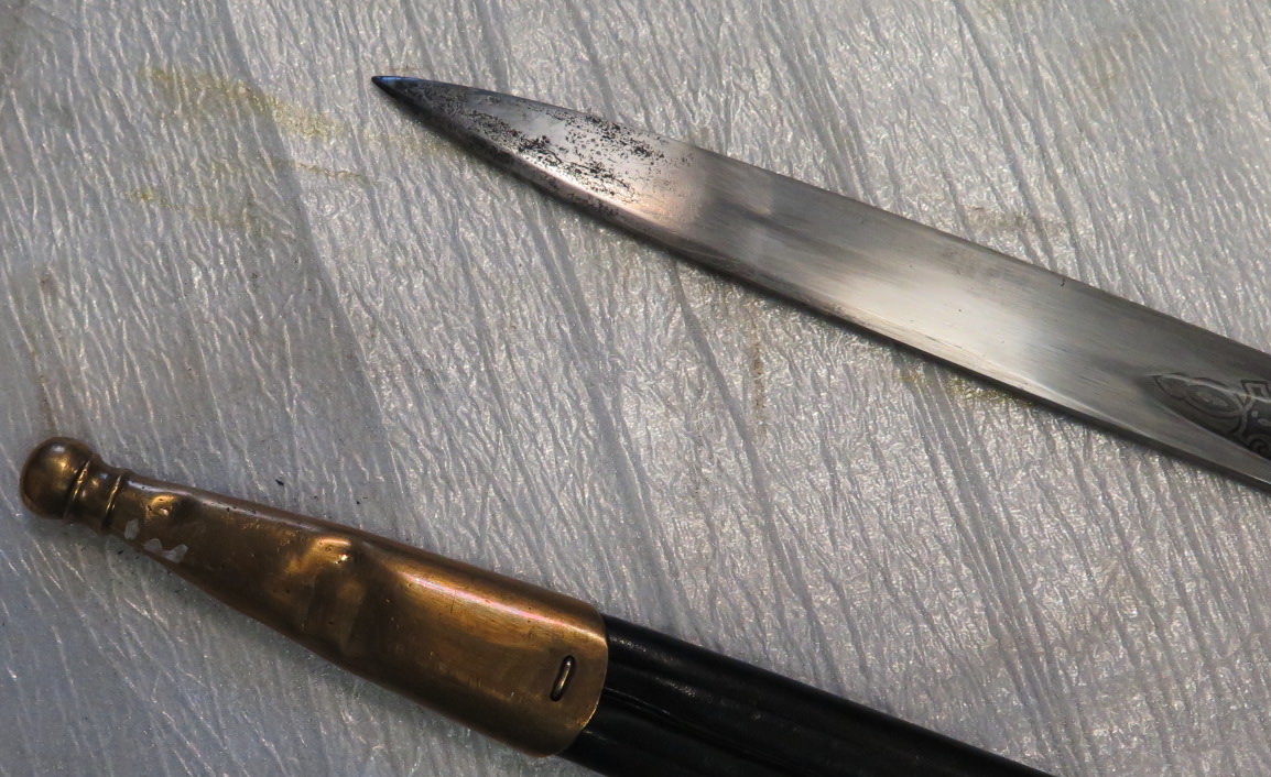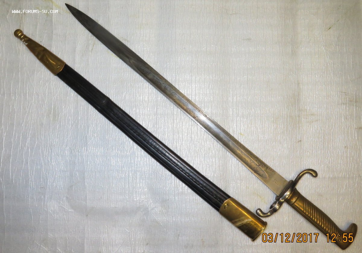 В отличном сохране.Гравировка с двух сторон.На нижней втулке ножен вмятины.Не частый предмет.