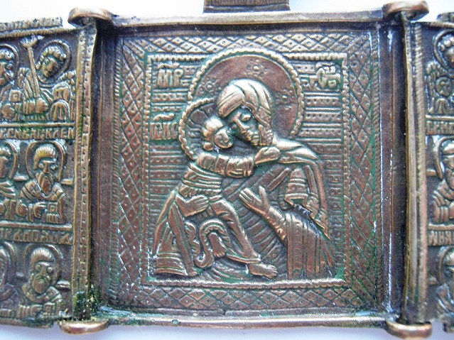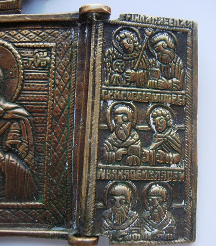 Складень с навершием "Спас Нерукотворный". В центре изображена Богоматерь с младенцем на правой руке. На створках в трех рядах поясные парные изображения святых в трехчетвертном повороте к центру. Левая створка: архангел Михаил и апостол Петр, святитель Василий Великий и великомученик Георгий, святители Иоанн Златоуст и Петр митрополит.