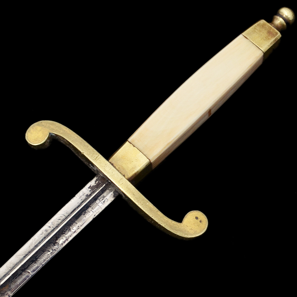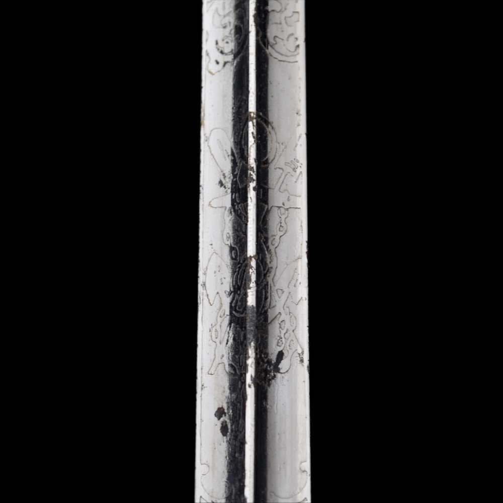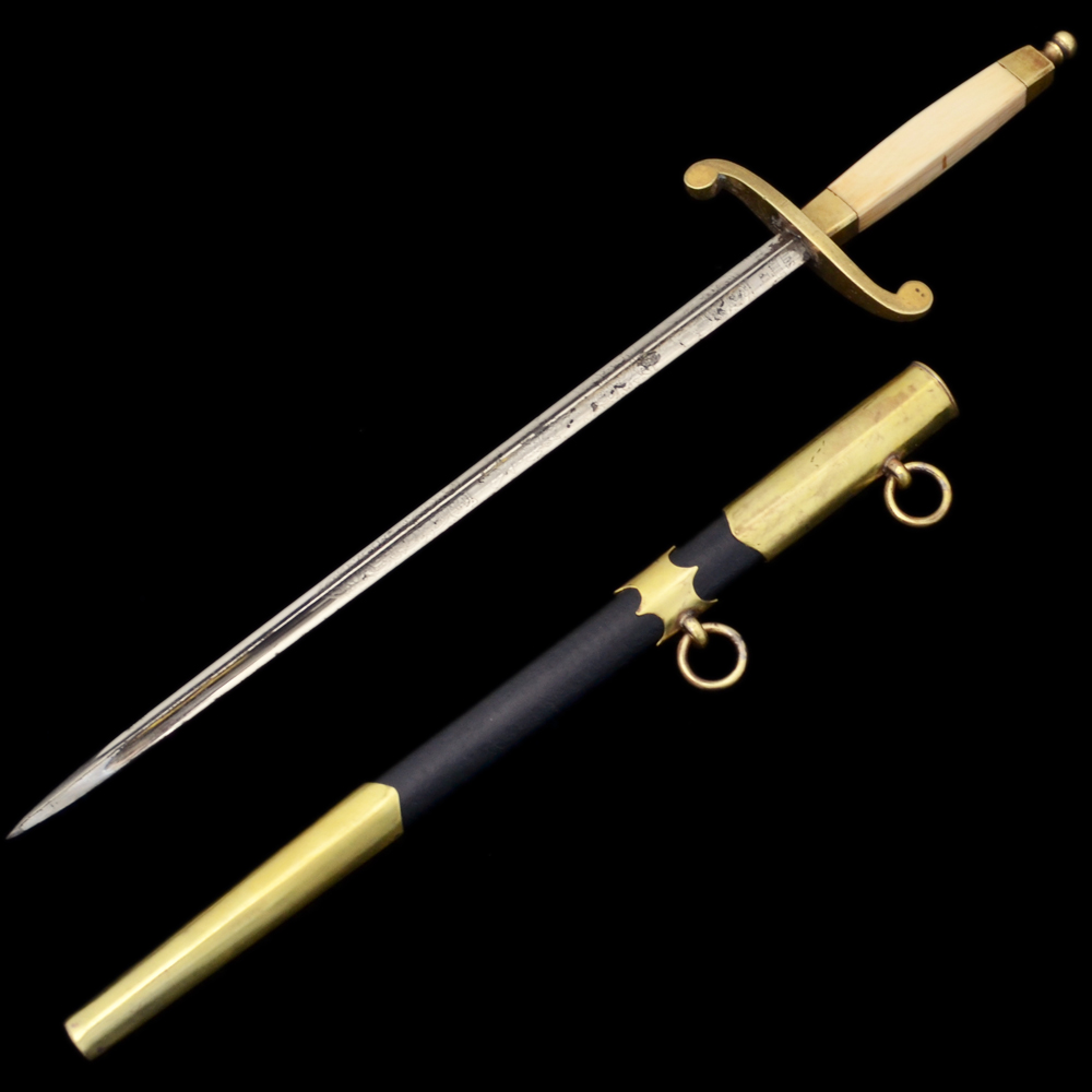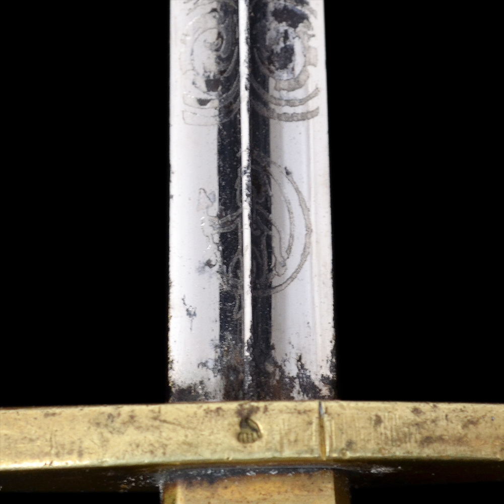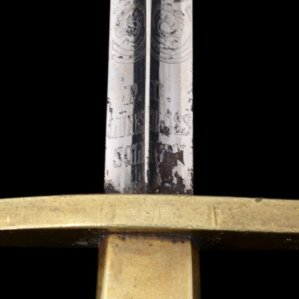 Описание: Чрезвычайно редкий кортик, известный в отечественных и зарубежных коллекциях всего в нескольких экземплярах. Клинок стальной четырехгранный, ромбического сечения, с четырьмя долами, равномерно сужающийся к боевому концу; острие клинка сходится в точку. Рукоять белая костяная, прямоугольного сечения, с небольшим уширением в средней части. Обоймицы рукояти, пуговка и бигель бронзовые. Клинок украшен рельефным растительным орнаментом и изображениями поставленного вертикально адмиралтейского якоря, двух скрещенных весел, якорной цепи и завязанного узлом каната. Данная композиция практически полностью повторяет специальный знак (эмблему), присвоенный в 1909 году для ношения на погонах нижними чинами минных частей (крепостных и речных минных рот). У основания клинка травлением нанесено клеймо производителя, выполненное в виде надписи «P.D. LUNESCHLOSS // SOLINGEN» в две строки, с оборотной стороны = логотип фирмы, выполненный в виде изображения Амура на полумесяце. Фирма «P.D. Luneschloss» была основана в 1810 году в Золингене, зарегистрирована 1881 году, прекратила существование в 1965 году. Первоначально фирма производила только ножи, затем различные виды холодного оружия. Производила холодное оружие также на экспорт – для Англии, Франции, Бельгии, Голландии, США. Изготавливала штыки различных образцов: сапёрные штыки-тесаки обр. 1865 и 1871 гг., фузилерный штык-тесак обр. 1860, штыки-тесаки обр. 1865 и 1871 гг., штыки обр. 1871 г., обр. 1871/84, обр. 1898 и обр. 1889/1905 гг. В период 1933–1945 гг. производила различные виды холодного оружия. RZM-код фирмы М7/14 и М7/1053. Ножны деревянные, обтянуты черной кожей со следами лакирования. Металлический прибор ножен состоит из устья, гайки и наконечника; на устье и гайке закреплены кольца для пасовых ремней. Сохранность отличная. Гарантия подлинности.