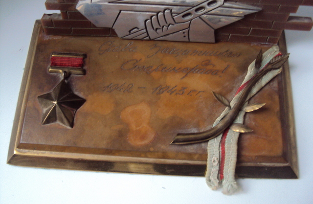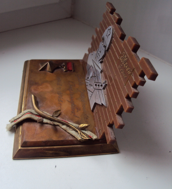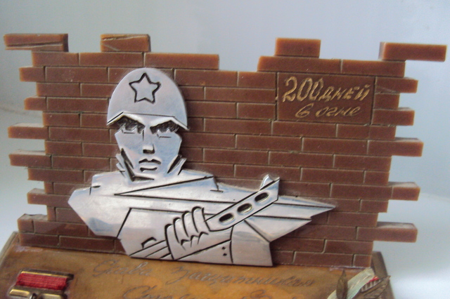 материал дерево. пластик. алюминий: сам солдат. латунь: звезда гсс , веточка.окантовка подставки. материя . ленточка к медали за оборону Сталинграда.