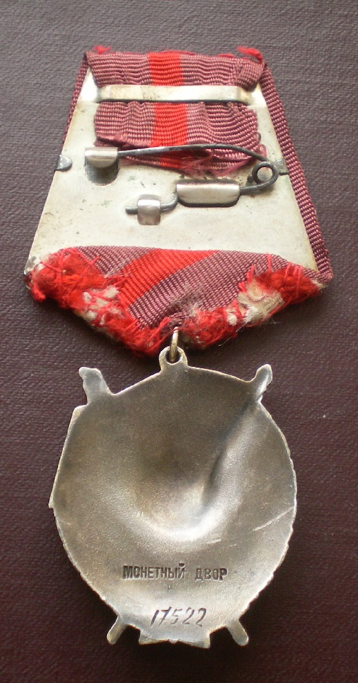 Вариант 4. Ордена четвертого варианта характеризуются плоской поверхностью реверса с четко выраженным "пальцевидным" вдавлением в центральной части. Производство знаков четвертого варианта началось в 1946 году и осуществлялось сериями на двух Монетных Дворах. В зависимости от вида клейма можно выделить две разновидности четвертого варианта. Минимальный известный номер – 16956, максимальный – 19365.