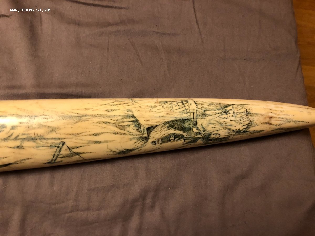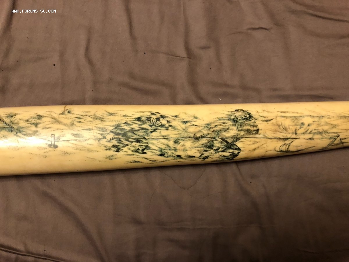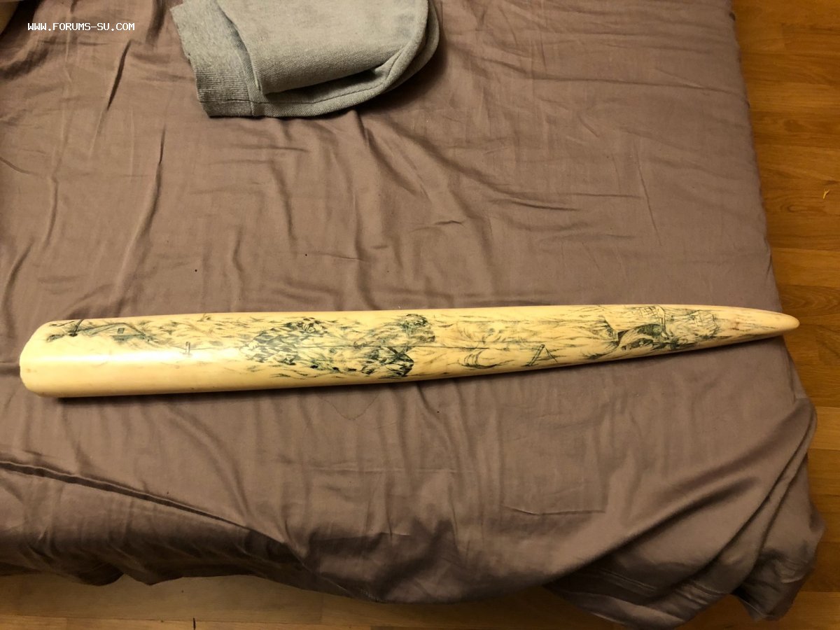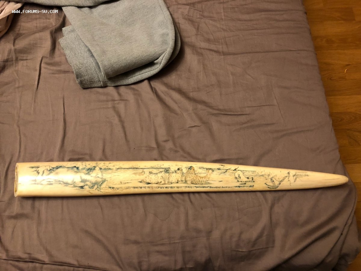 Клык без повреждений. Вес 2,39 кг, длина 69 см.