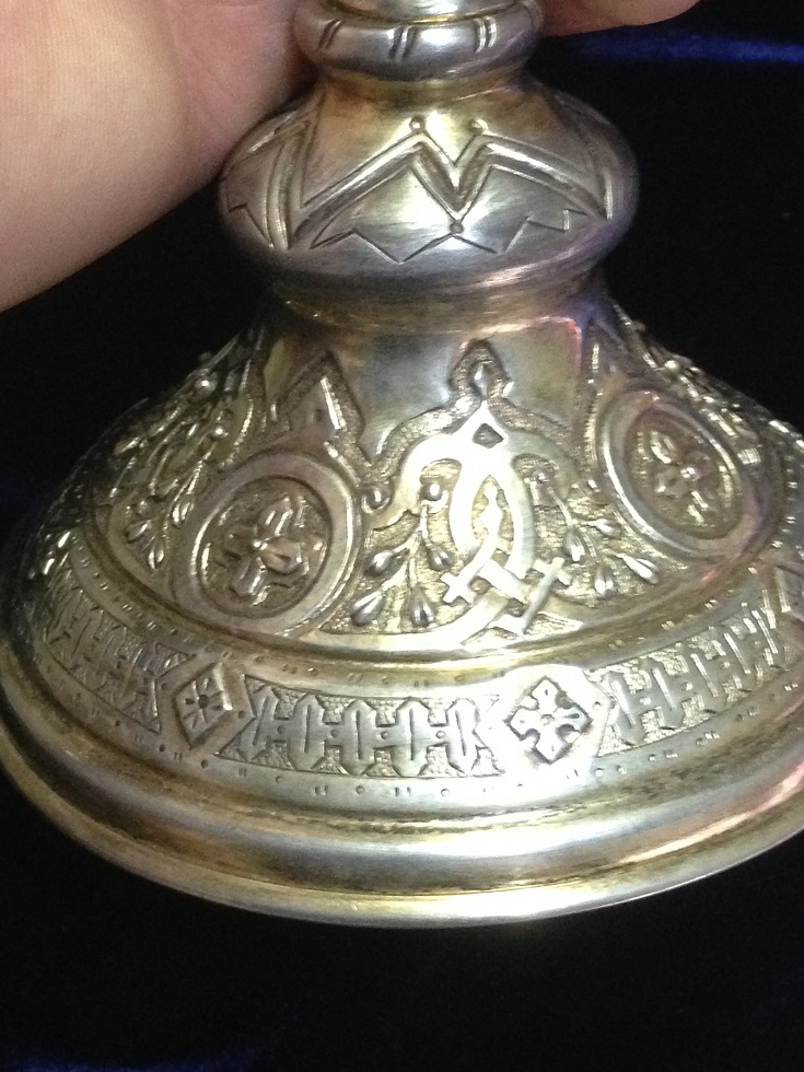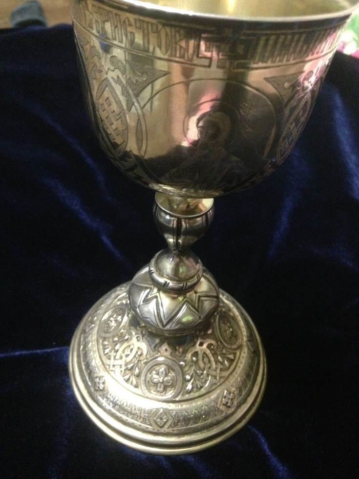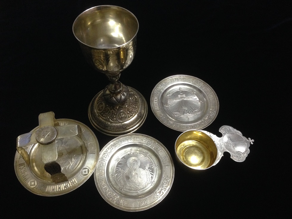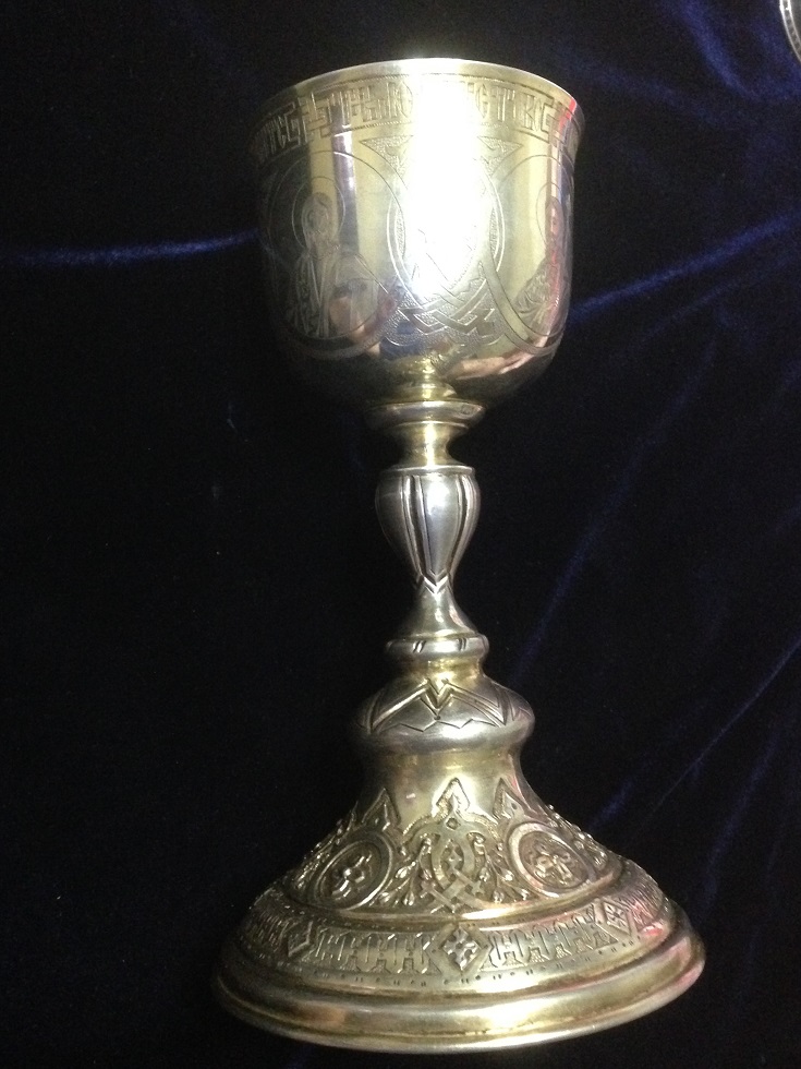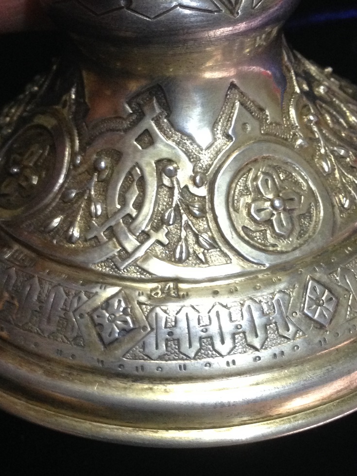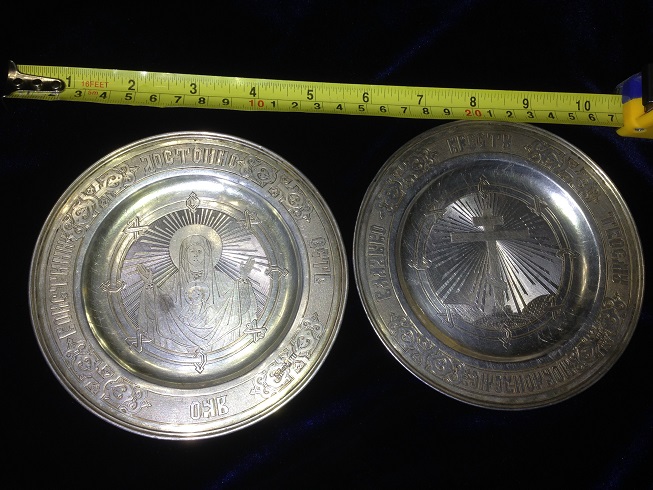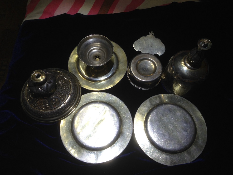 К продаже вот такой комплект, Потир, дискос, две тарели, звездица и корец. Потир, дискос и звездица 1878г тарели 1886г, корец просто с клеймами. Вес всего 721гр, чаша оч красивая с остатками золочения, на фото видно, объемом ( если до краев почти 250мл) . Размеры Потир выс. 19.2см, диаметр чаши 8.3см, низ 11.3см. Дискос диаметр 12.1см. Тарели 13см.мпц 450тр + отправка. Только почта РФ или EMS.