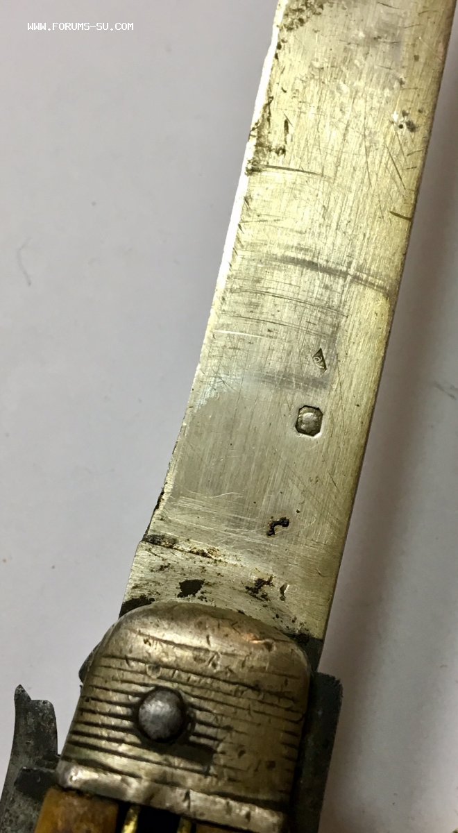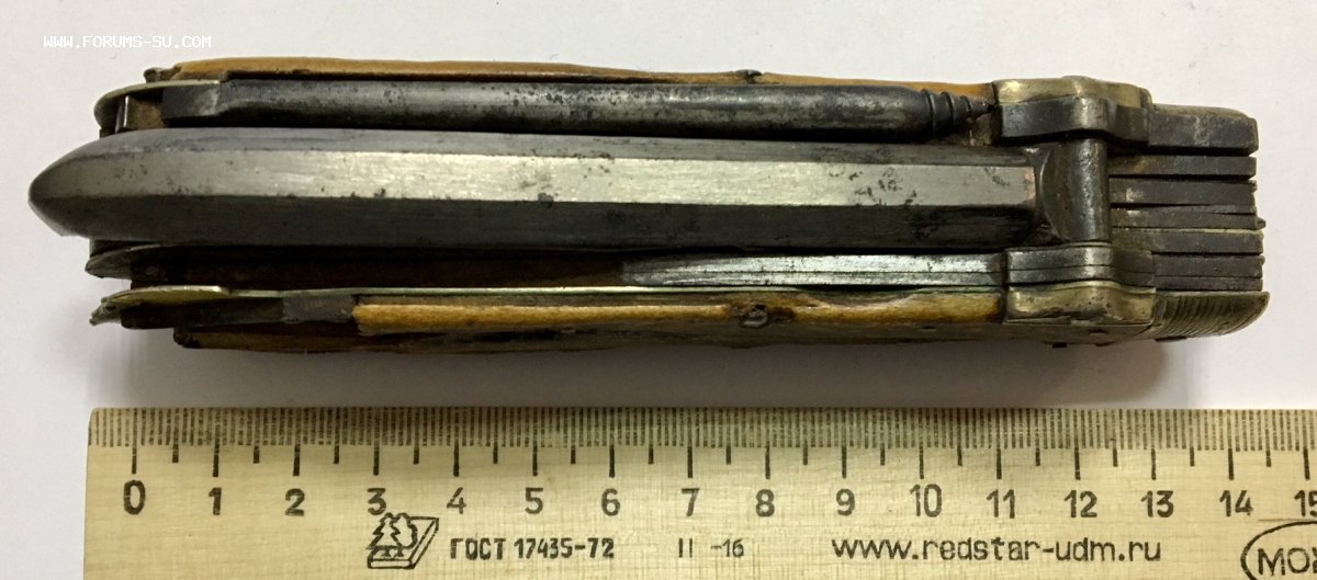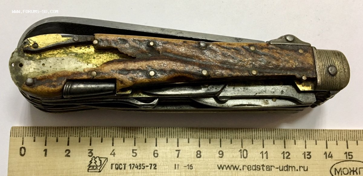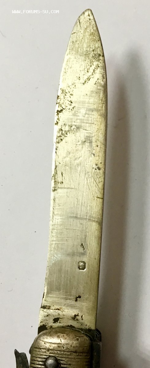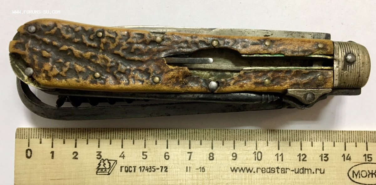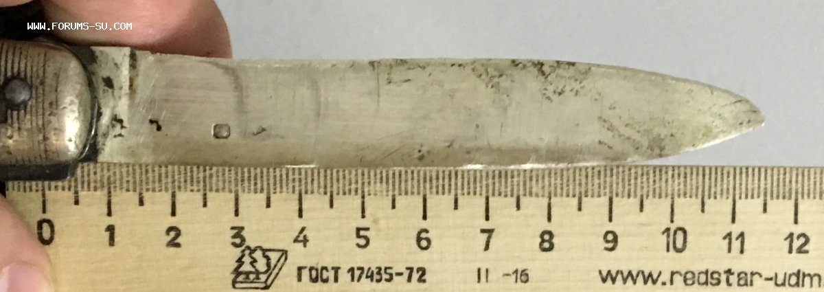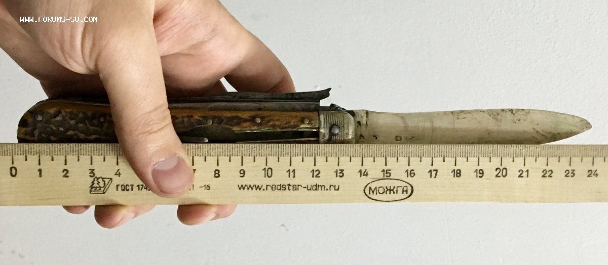 Рукоять массивная, с накладками из натурального оленьего рога. Одно из лезвий серебряное (для резки еды и продуктов). Клейма на серебре показал крупно и со всех ракурсов. Размеры ножа в складном и разложенном виде хорошо видно на фото (специально линейку положил рядом с ножом).