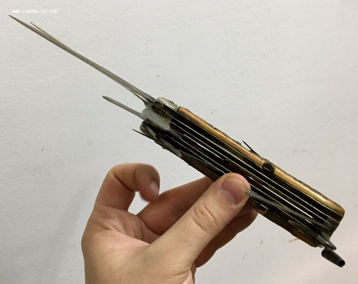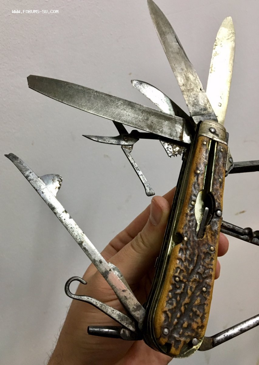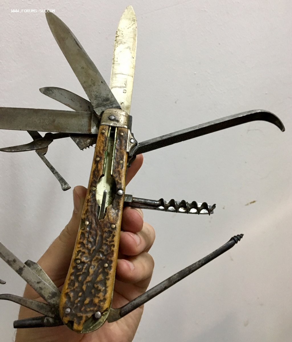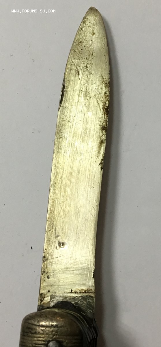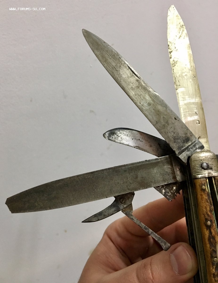 Рукоять массивная, с накладками из натурального оленьего рога. Одно из лезвий серебряное (для резки еды и продуктов). Клейма на серебре показал крупно и со всех ракурсов. Размеры ножа в складном и разложенном виде хорошо видно на фото (специально линейку положил рядом с ножом).