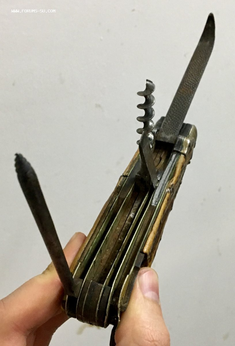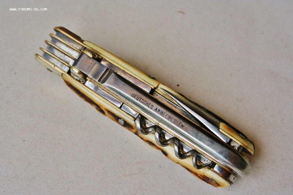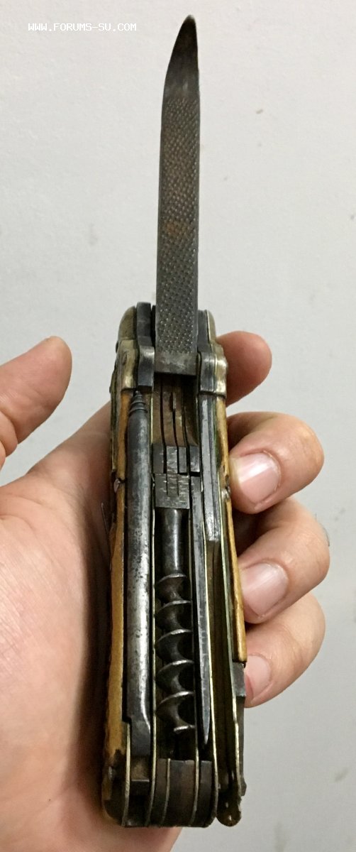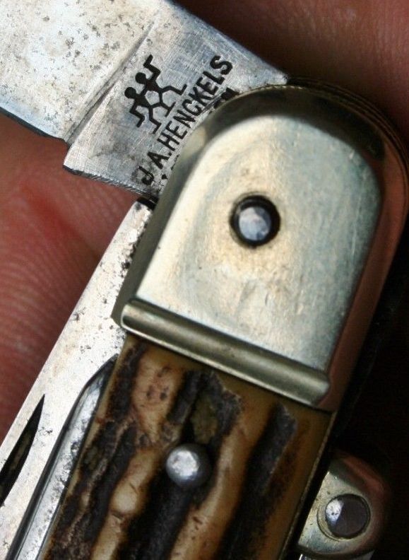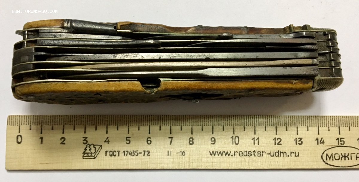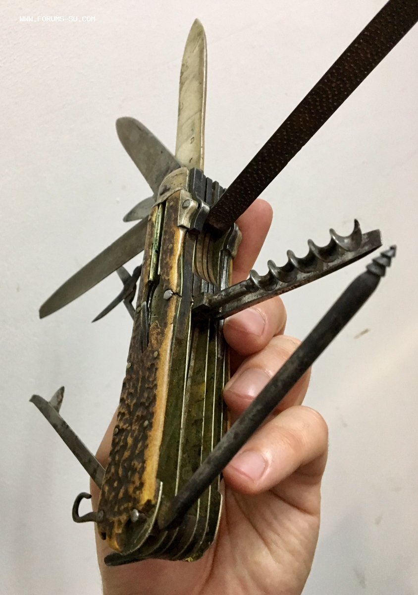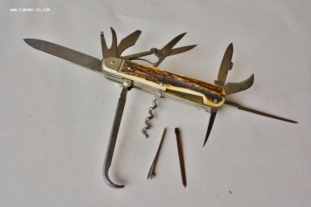 Рукоять массивная, с накладками из натурального оленьего рога. Одно из лезвий серебряное (для резки еды и продуктов). Клейма на серебре показал крупно и со всех ракурсов. Размеры ножа в складном и разложенном виде хорошо видно на фото (специально линейку положил рядом с ножом).