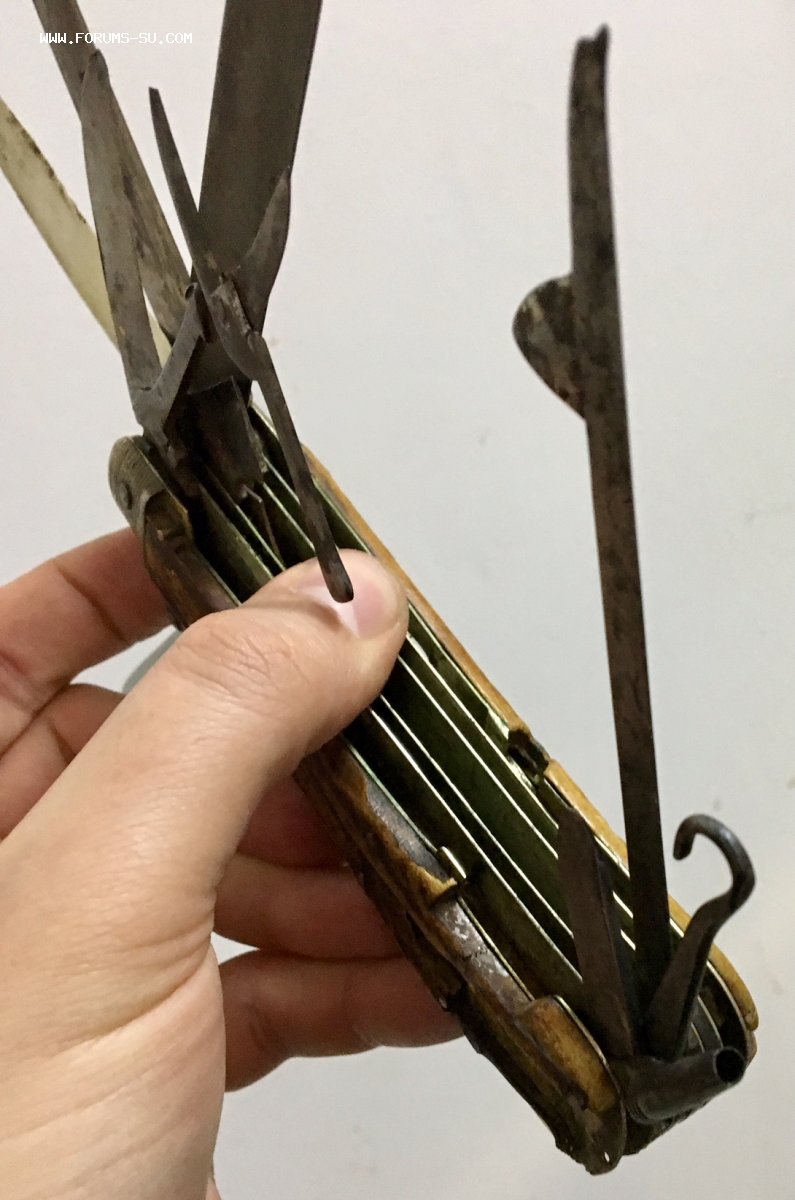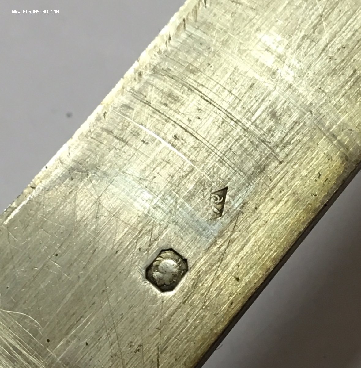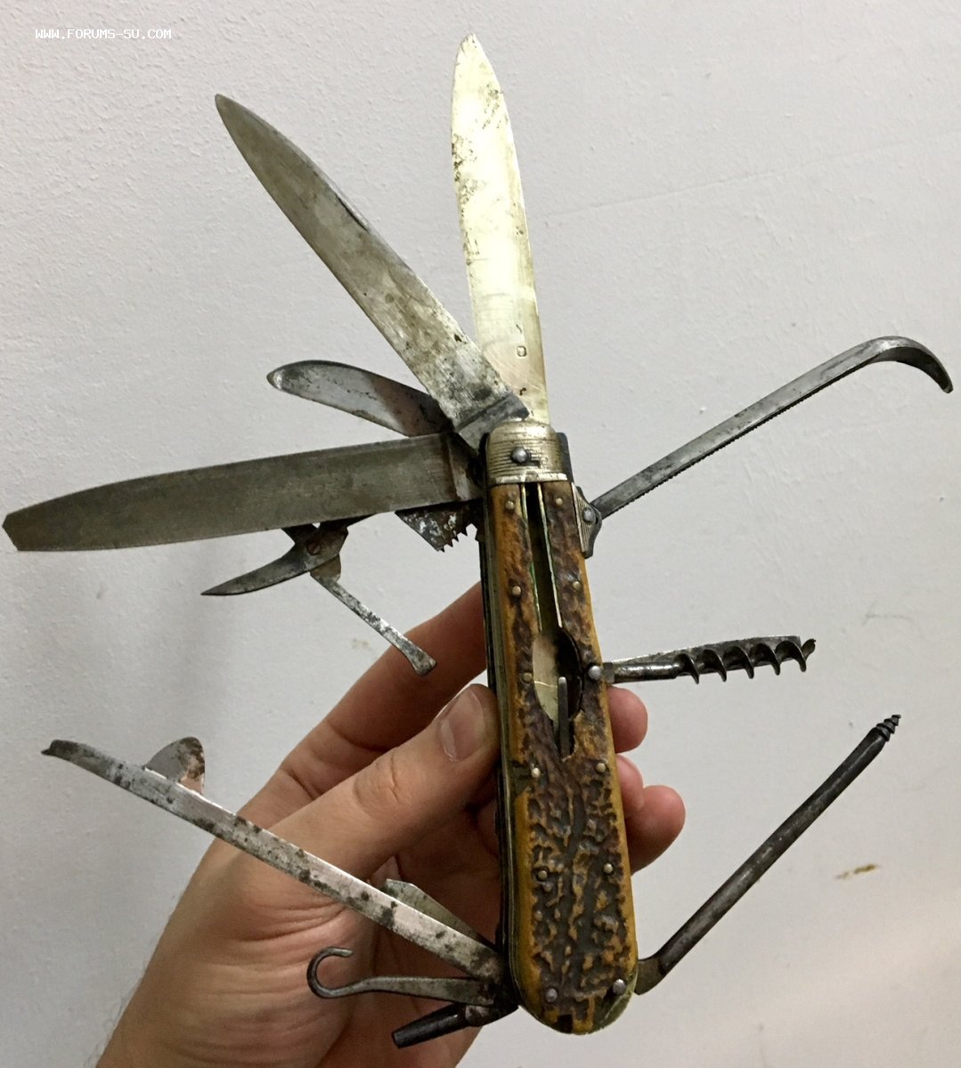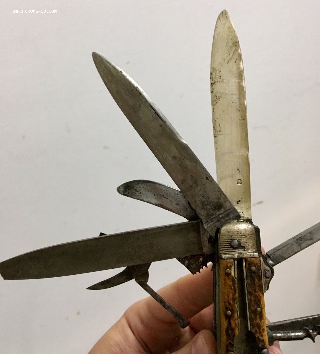 Рукоять массивная, с накладками из натурального оленьего рога. Одно из лезвий серебряное (для резки еды и продуктов). Клейма на серебре показал крупно и со всех ракурсов. Размеры ножа в складном и разложенном виде хорошо видно на фото (специально линейку положил рядом с ножом).