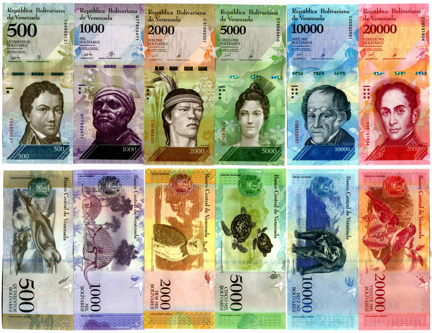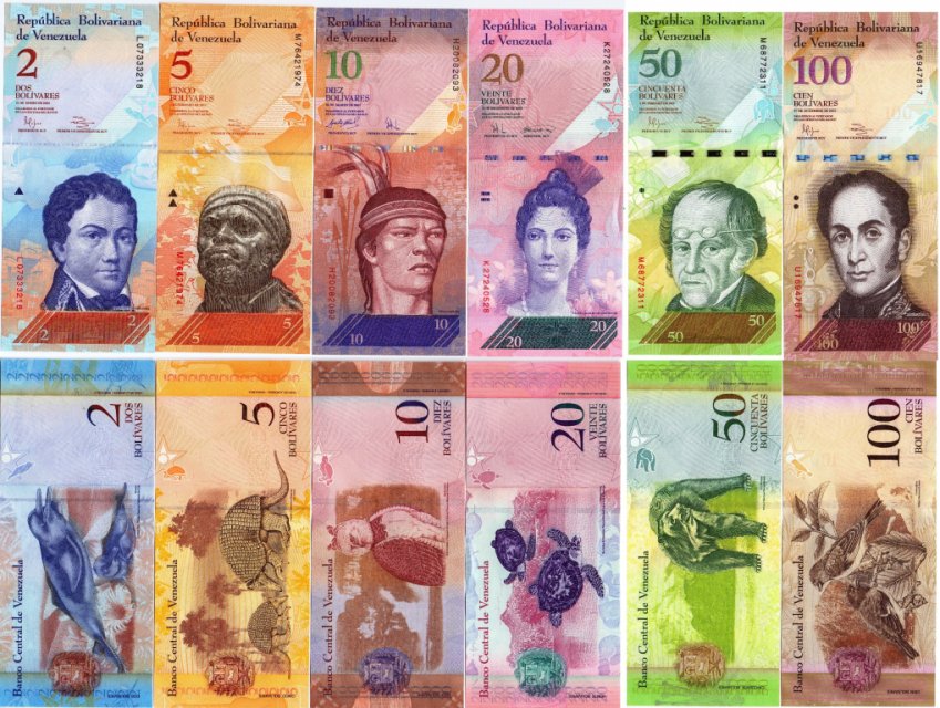 В набор входят 2, 5, 10, 20, 50, 100 боливар. На банкнотах изображения с одной стороны знаменитых людей, с другой стороны - животных и птиц.